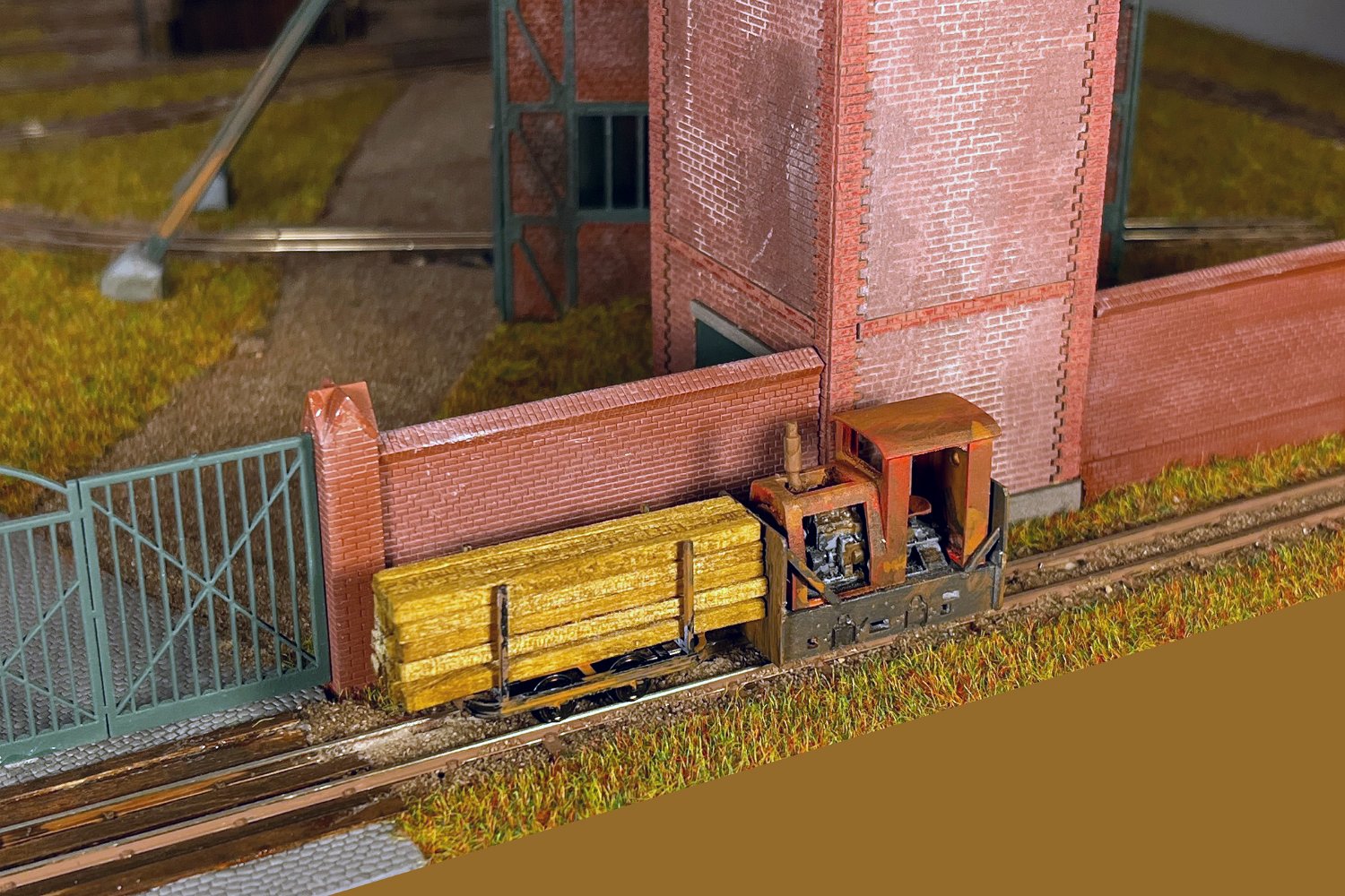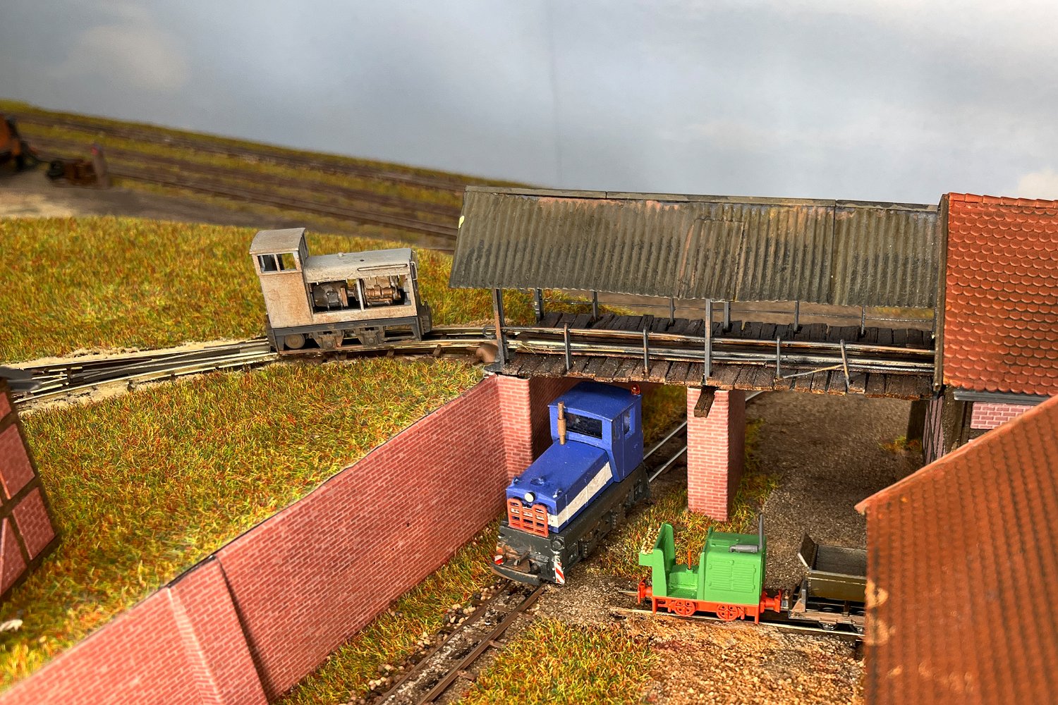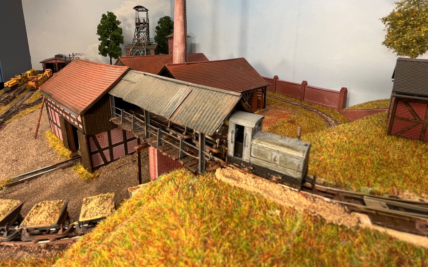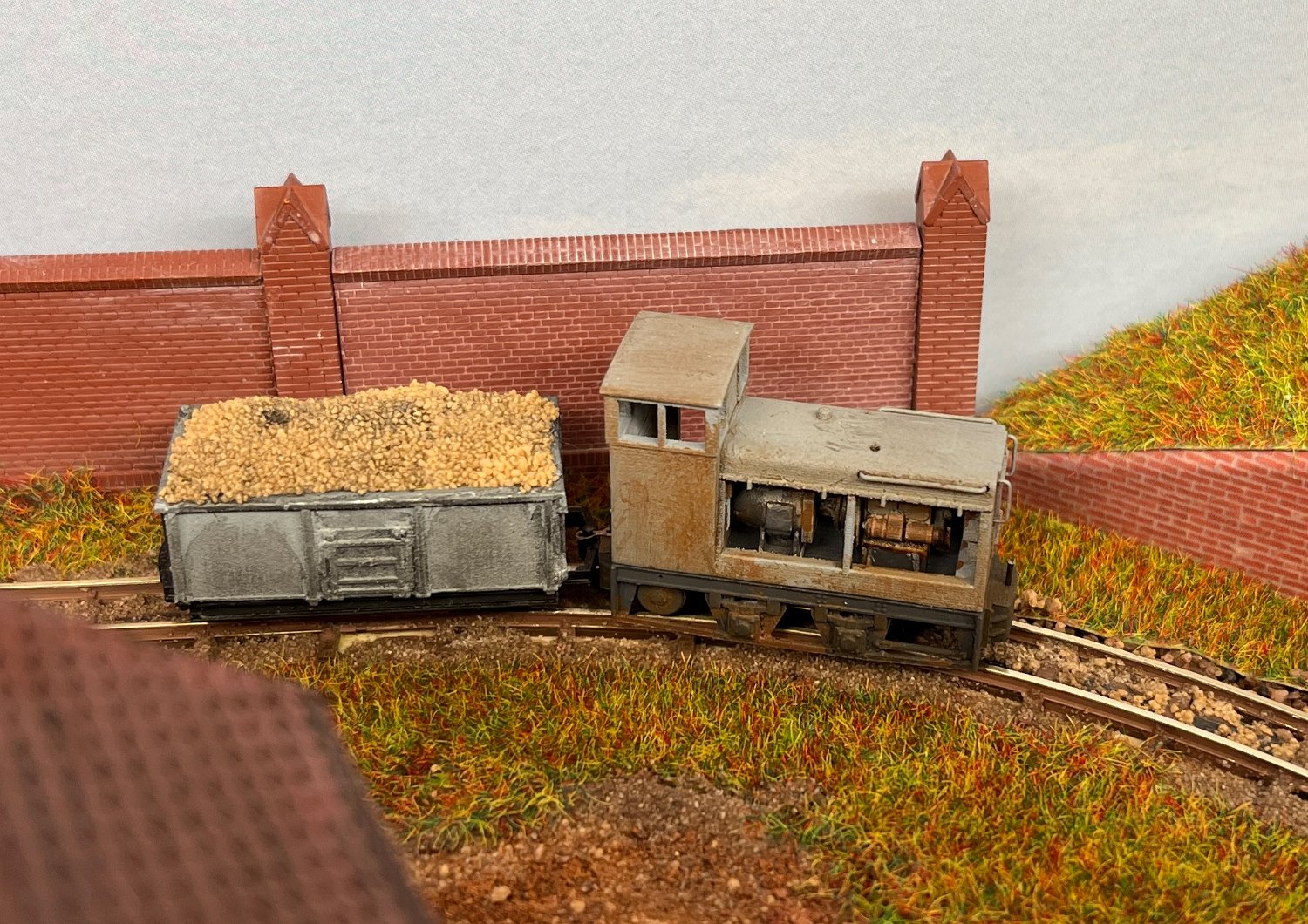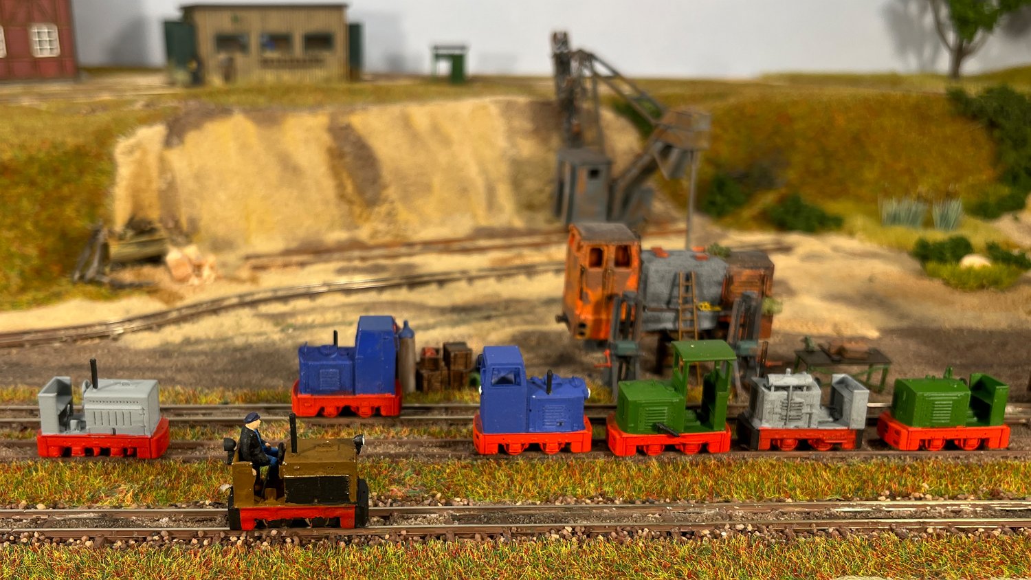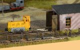 11 Die Lokschuppen ohne Details, der Busch-Bagger steht noch lose und schief, aber es ging gut weiter. Die 20-PS-Simplex ist derzeit mein kleinstes rollfähiges Lok-Modell und wird hier vom Ziegelbruch-Geisterwagen geschoben. |