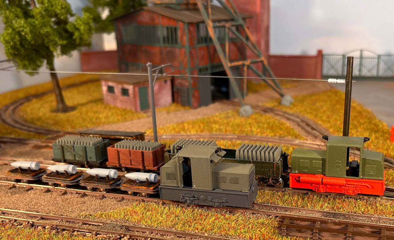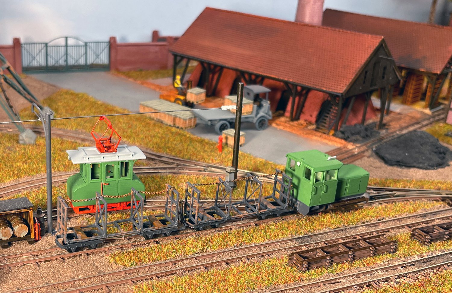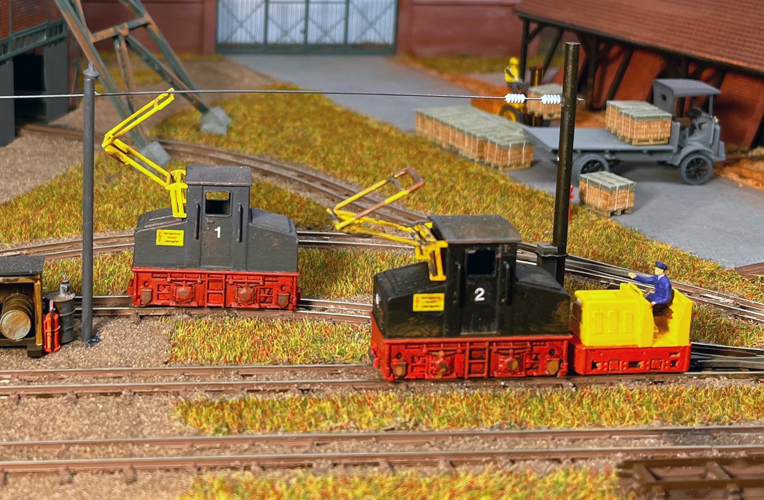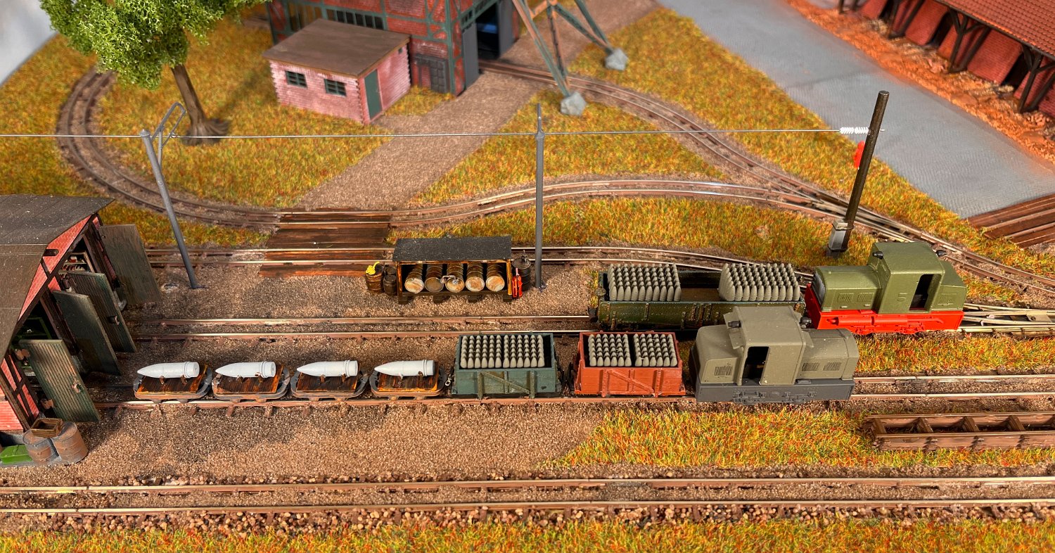 29 Zwei Jung ZL 233 an der Dieseltankstelle. Dahinter endet die elektrifizierte Strecke die irgendwann von einem Waldbahn-Modul kommen soll. Dafür stehen zwei SSW-Fahrleitungsloks zur Verfügung. |