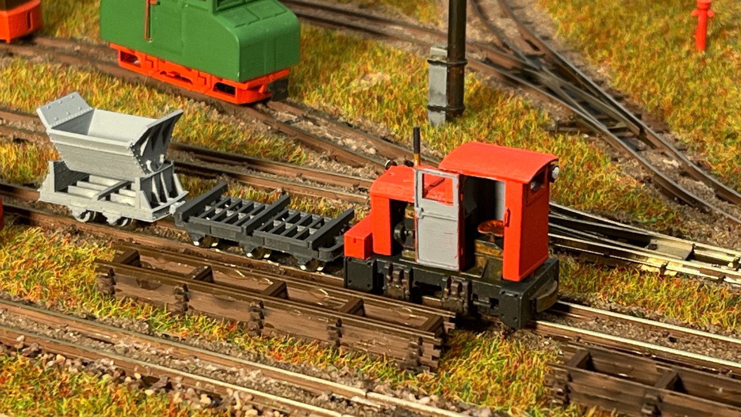 18 Die Kent Construction Company baute auf Basis der Simplex-40-PS-Lok das Vorbild für dieses Modell, das mit dem angehängten Kies-Geisterwagen fahrfähig ist. |