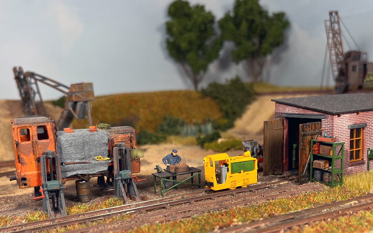 30 Die untere Ebene macht Fortschritte: Auf einer Winde wartet ein V10C auf die Aufarbeitung, am Tümpel wächst Schilf und der zweite Bagger steht endlich mit straffen Seilen richtig eingegleist da. |
