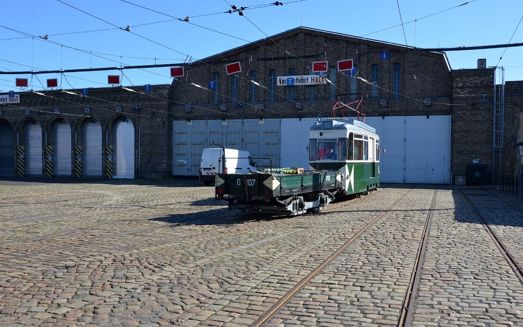 32 Am 01.04.2016 im Betriebshof Nordend: Nachdem die Ladung gesichert ist fahren ATZ 4508 mit Lore G 107 nach Nalepastraße und Köpenick.