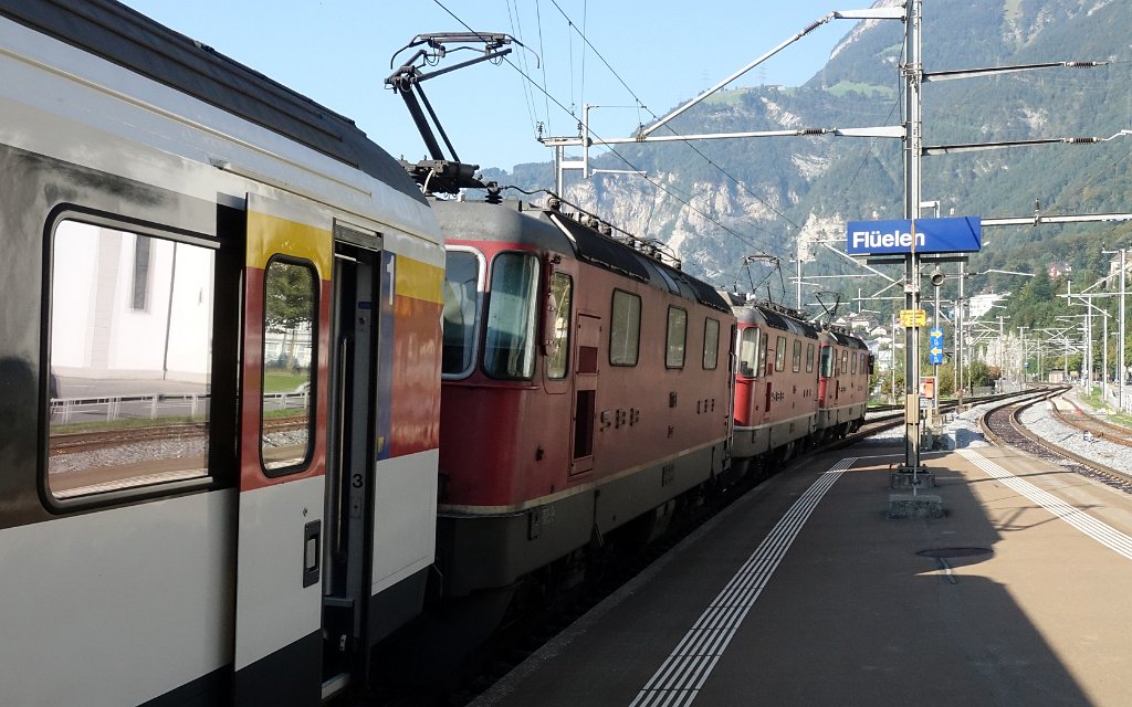 9 Der IR nach Basel mit Dreifachtraktion und 20 min Verspätung, beides ungewöhnlich in der Schweiz. (Flüelen am 24.09.2016) |
