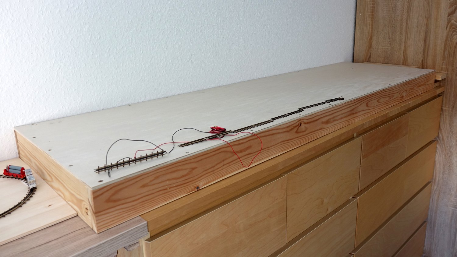 4 Nach 50 Jahren stand ich im Mai 2021 wieder vor einer leeren Anlage. Die Abmessungen von 1600x400 mm wurde durch die Schränke vorgegeben. Links das kleine Testoval für Versuchsfahrten. |