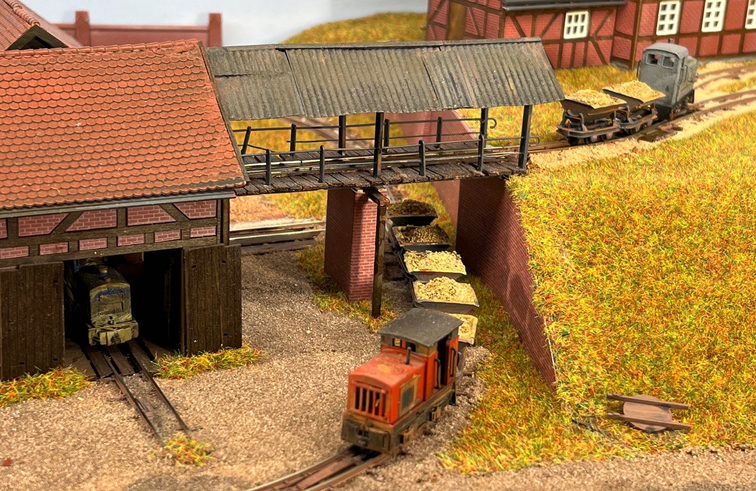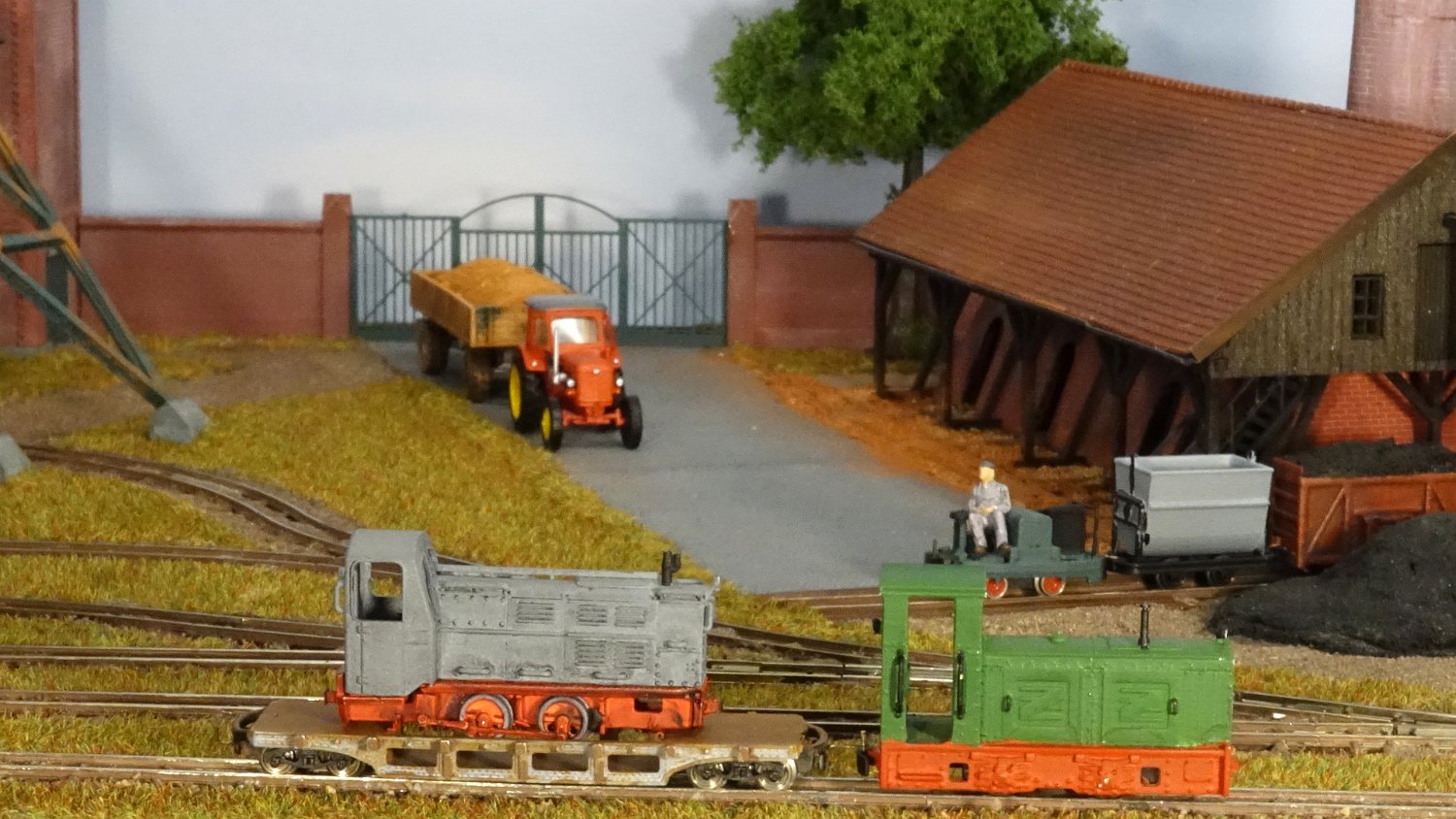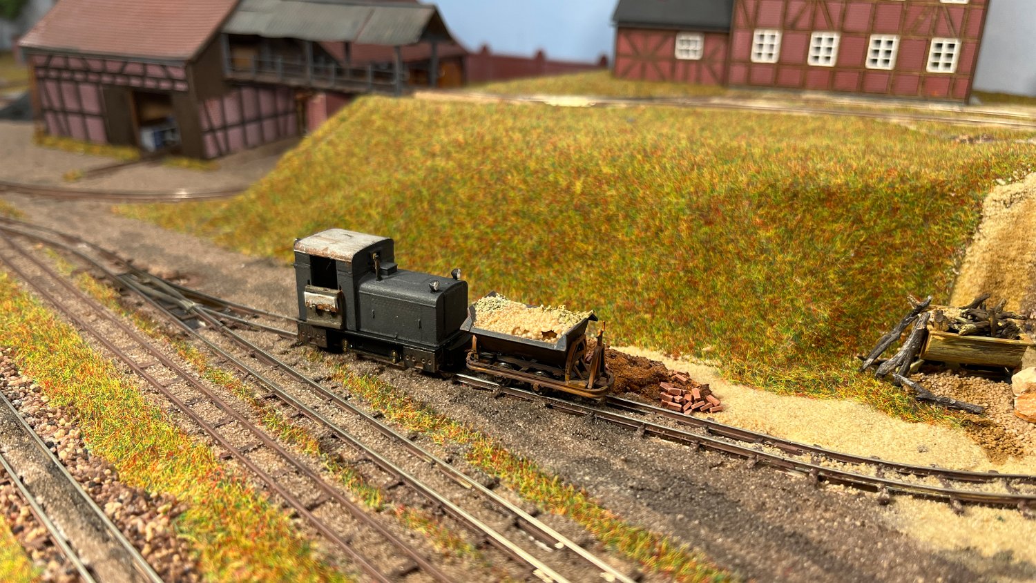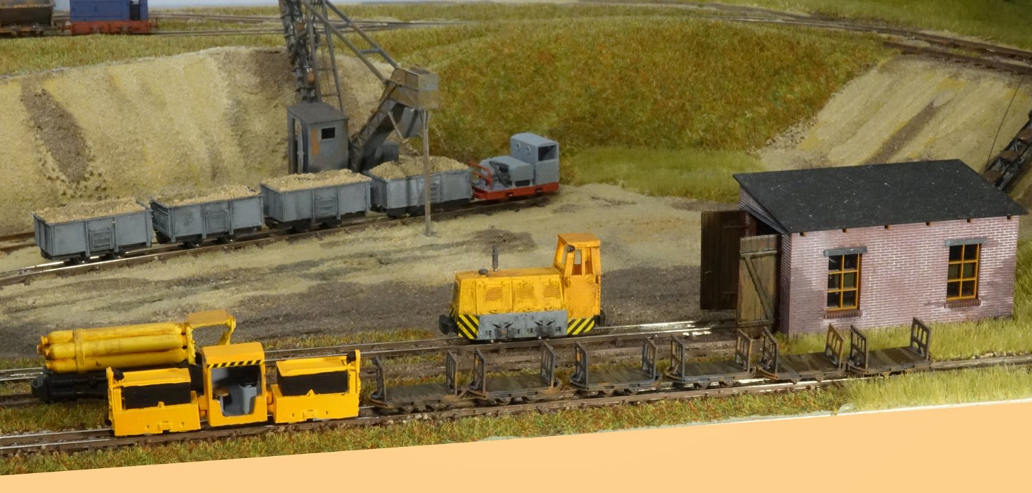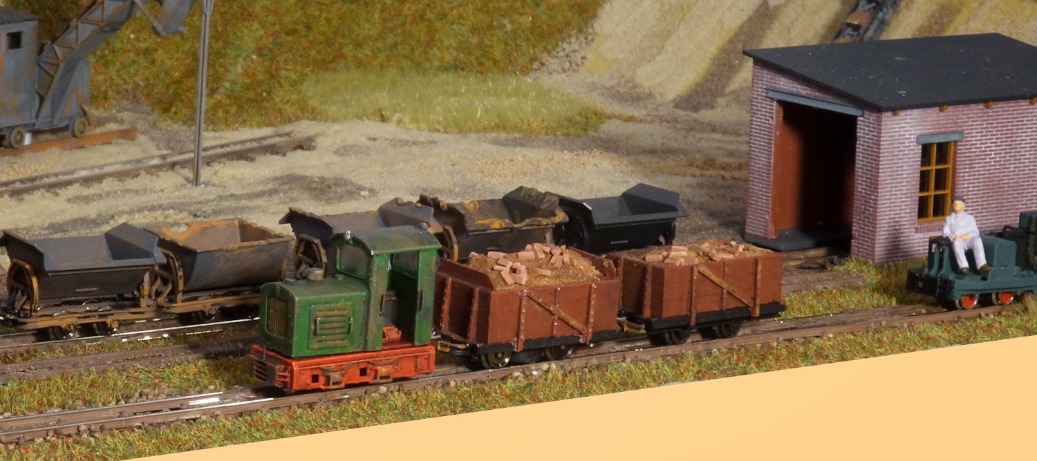 11 Die Lokschuppen ohne Details, der Busch-Bagger steht noch lose und schief, aber es ging gut weiter. Die 20-PS-Simplex ist derzeit mein kleinstes rollfähiges Lok-Modell und wird hier vom Ziegelbruch-Geisterwagen geschoben. |