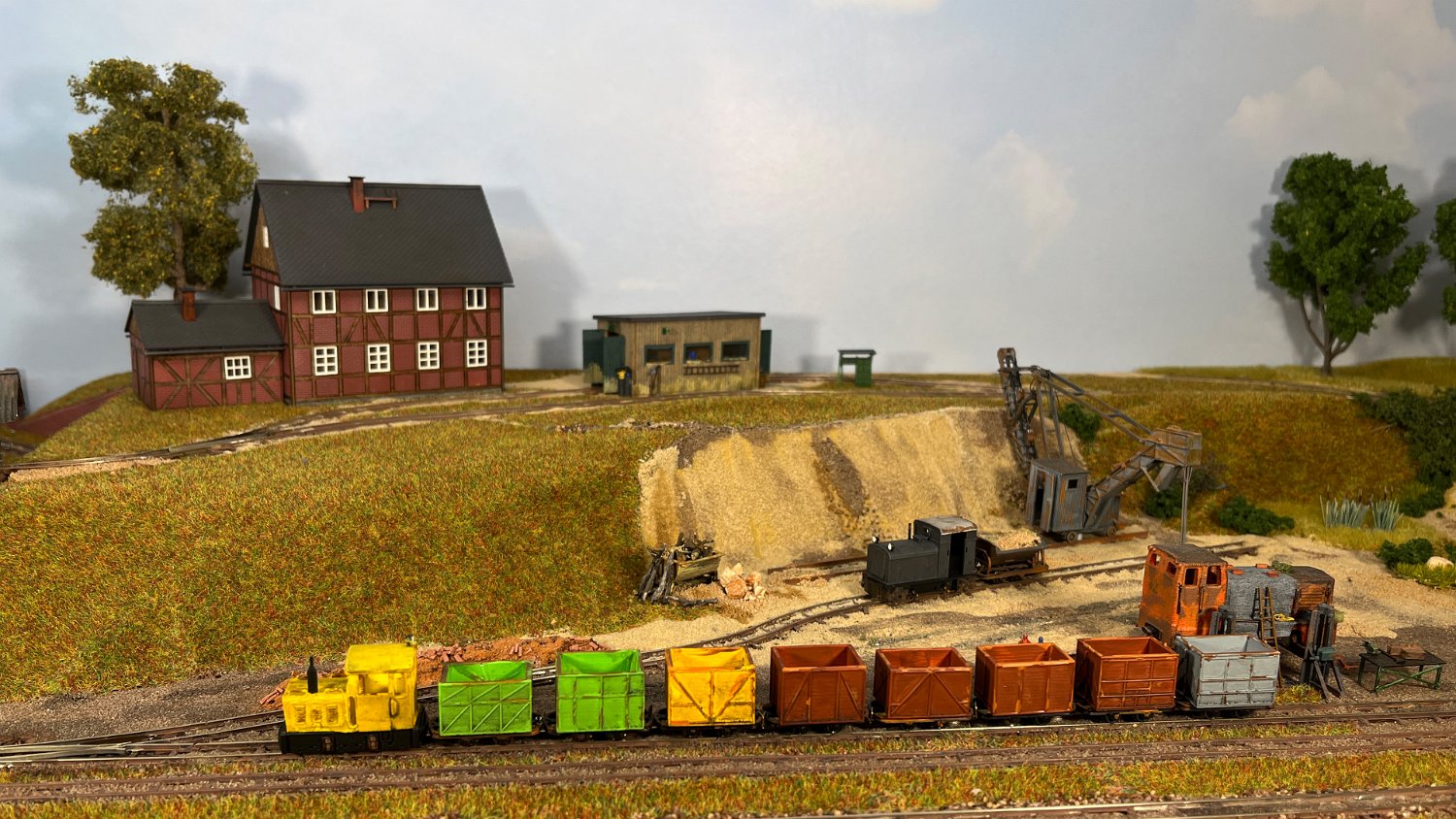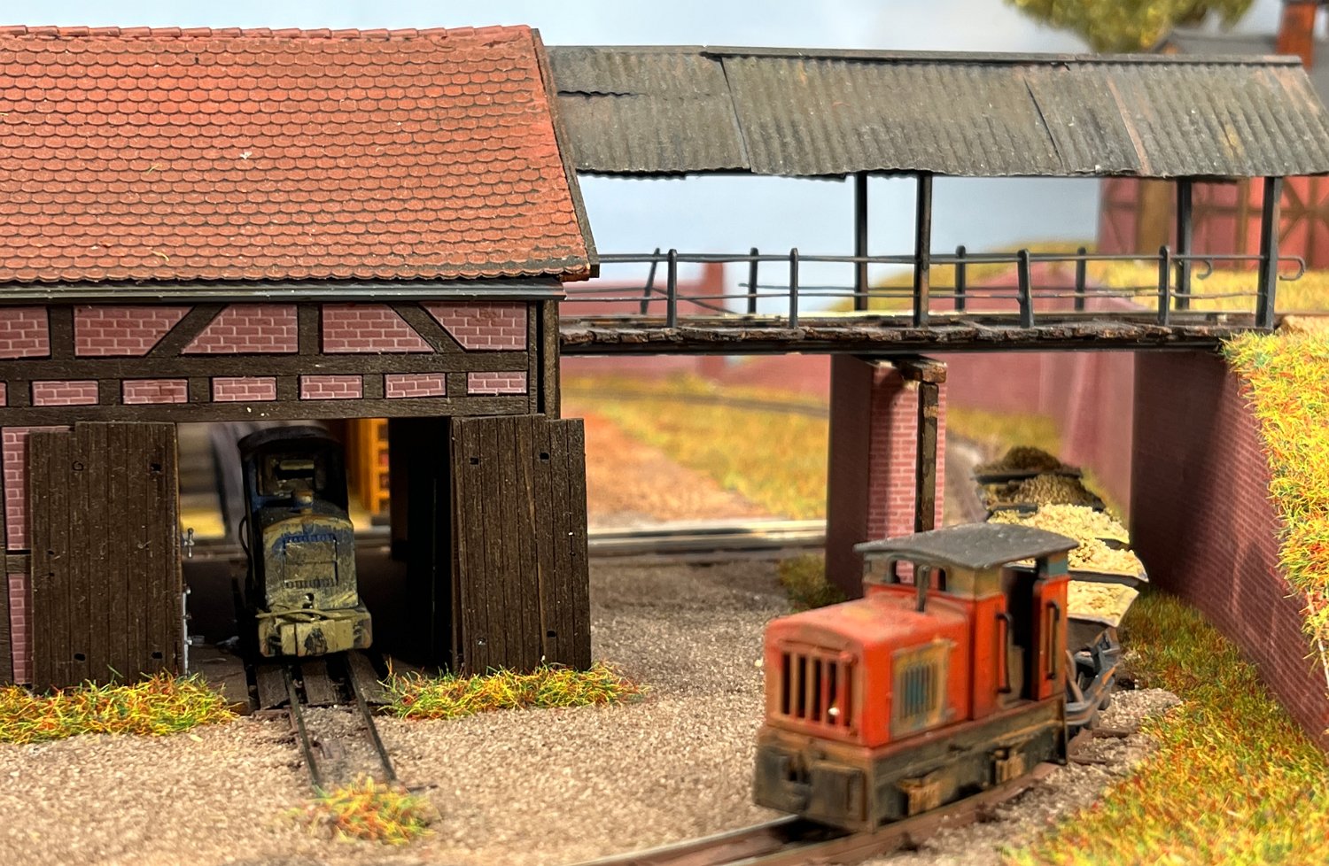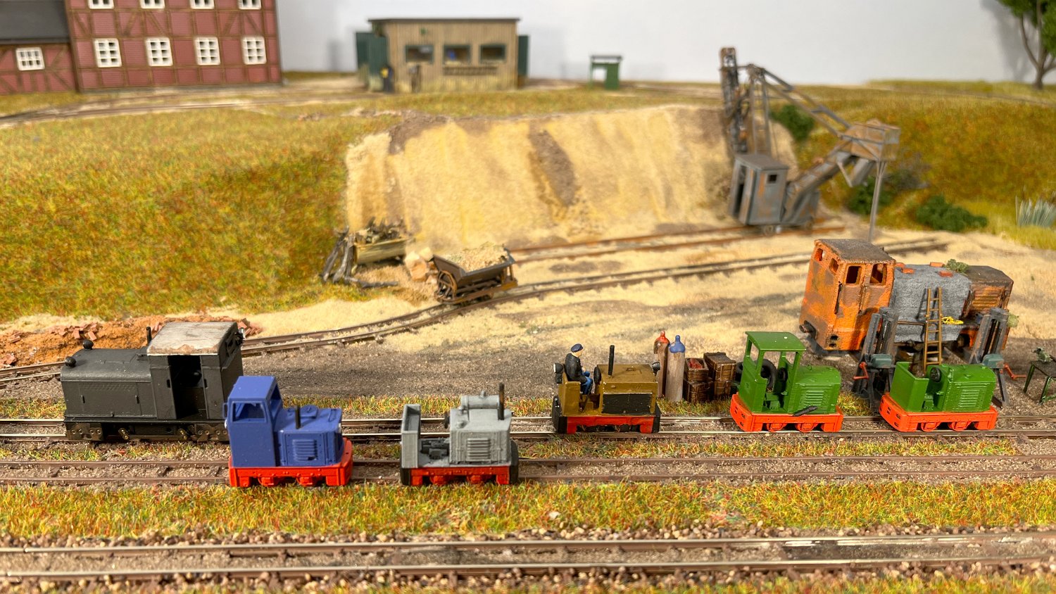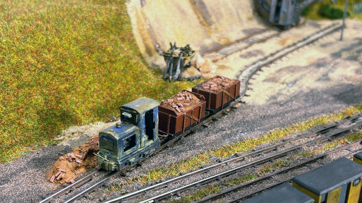 11 Die Lokschuppen ohne Details, der Busch-Bagger steht noch lose und schief, aber es ging gut weiter. Die 20-PS-Simplex ist derzeit mein kleinstes rollfähiges Lok-Modell und wird hier vom Ziegelbruch-Geisterwagen geschoben. |