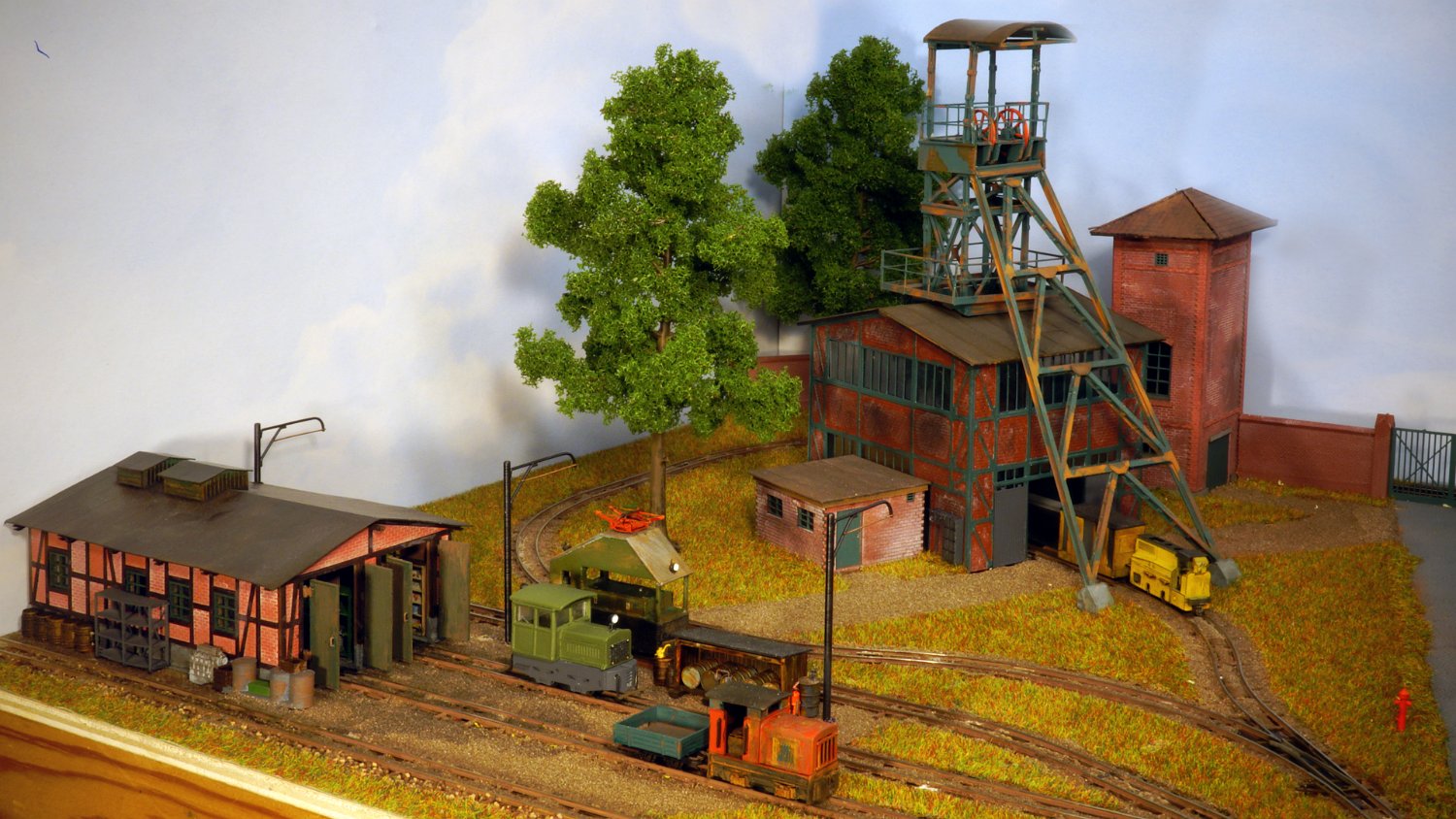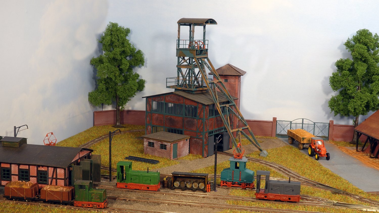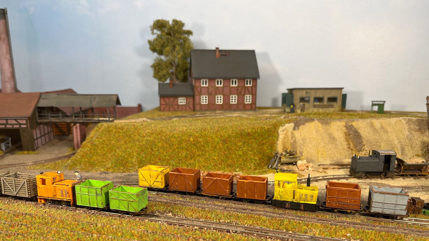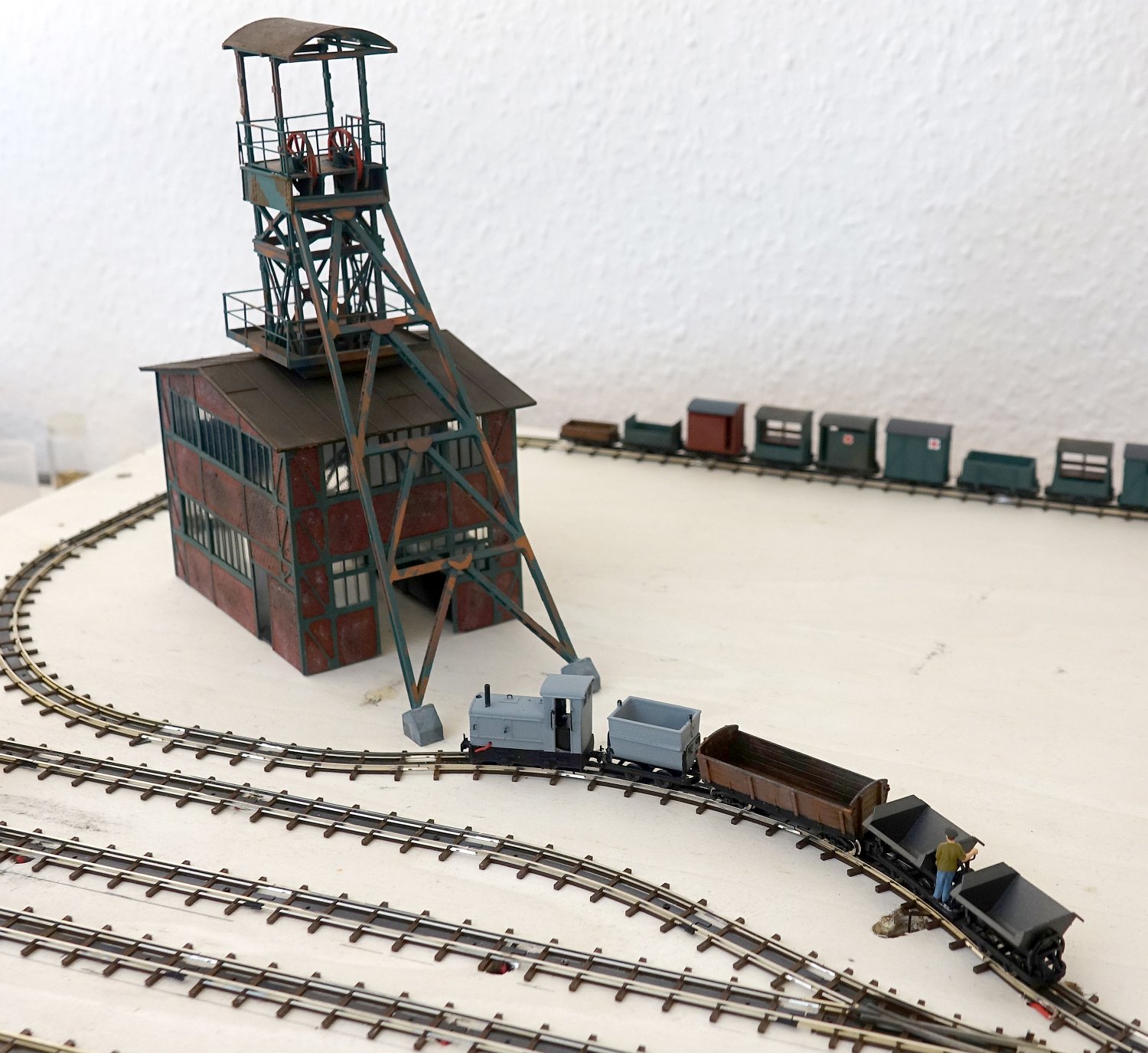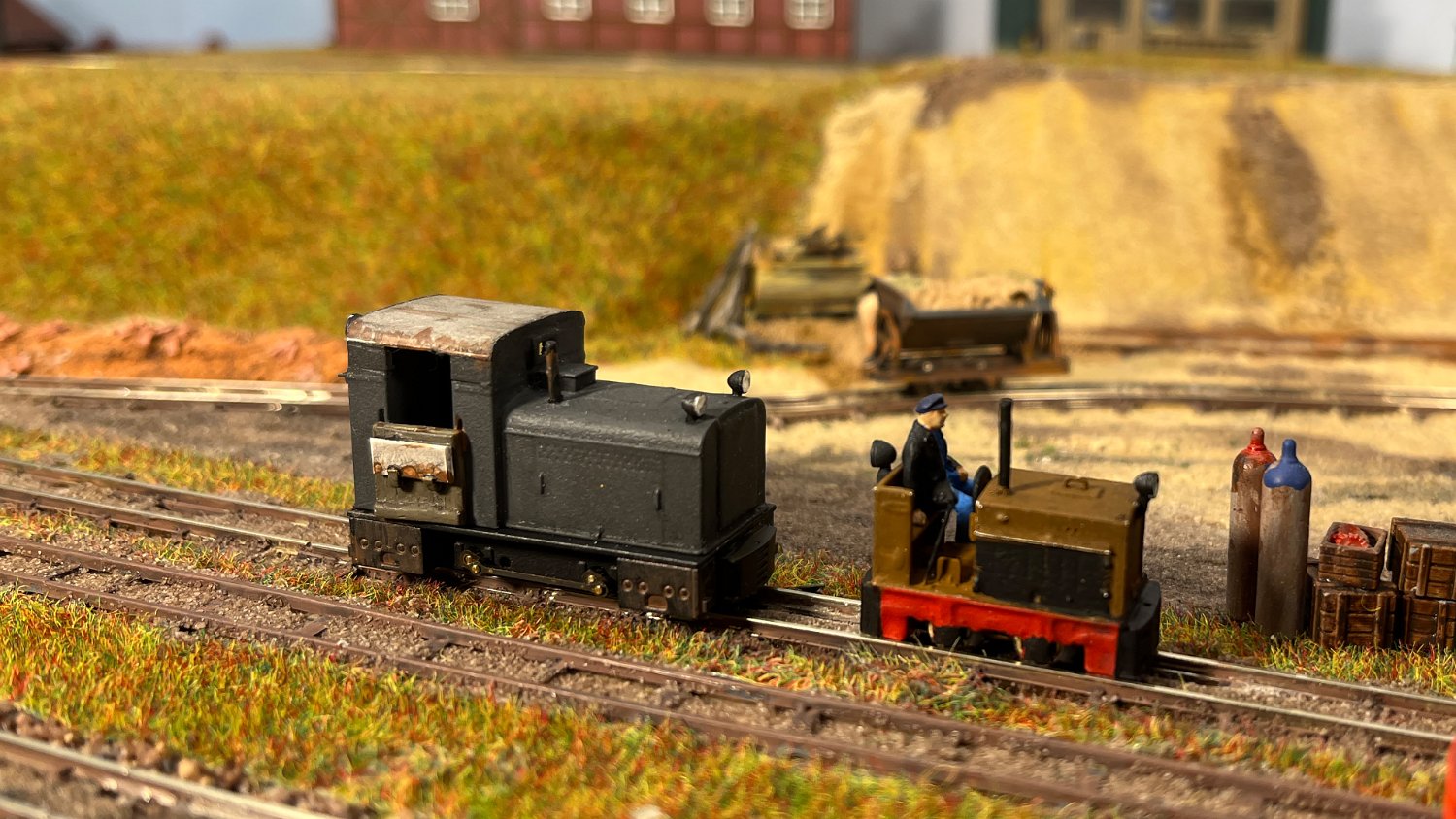 11 Die Lokschuppen ohne Details, der Busch-Bagger steht noch lose und schief, aber es ging gut weiter. Die 20-PS-Simplex ist derzeit mein kleinstes rollfähiges Lok-Modell und wird hier vom Ziegelbruch-Geisterwagen geschoben. |