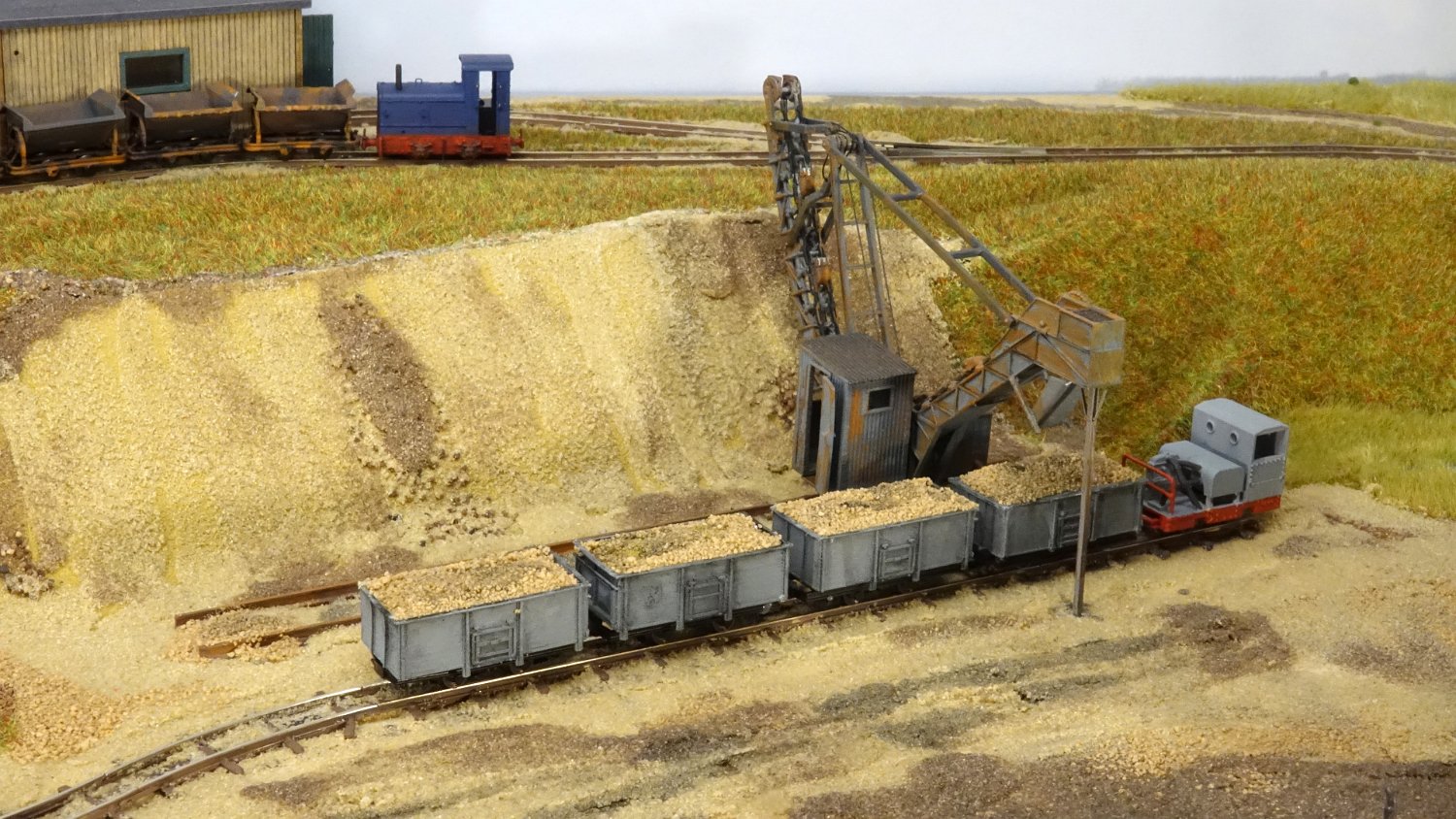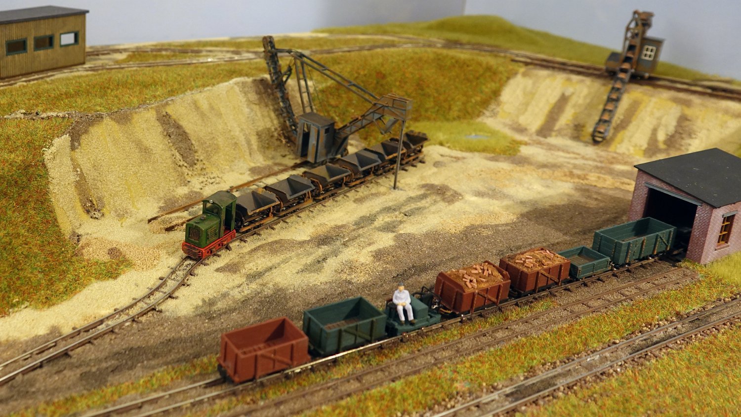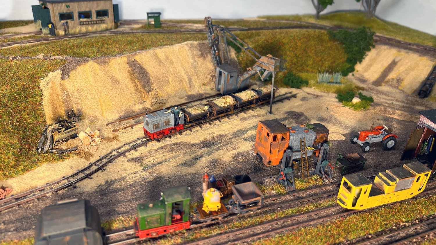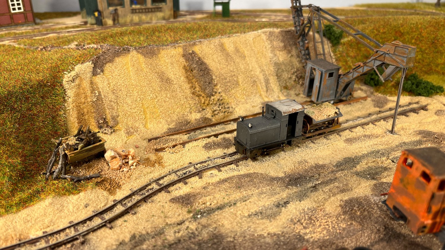 30 Die untere Ebene macht Fortschritte: Auf einer Winde wartet ein V10C auf die Aufarbeitung, am Tümpel wächst Schilf und der zweite Bagger steht endlich mit straffen Seilen richtig eingegleist da. |