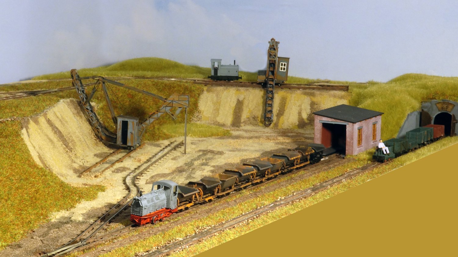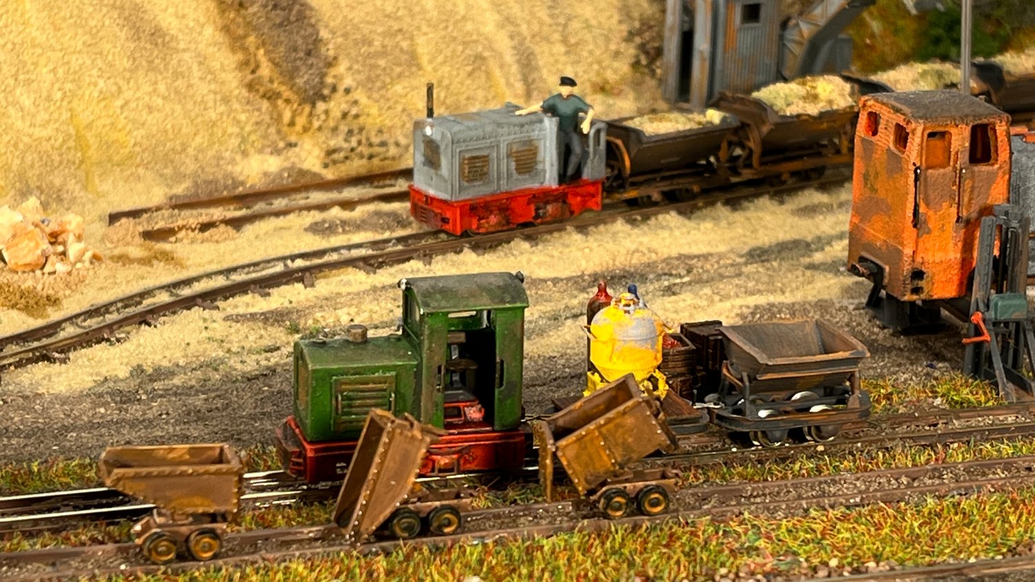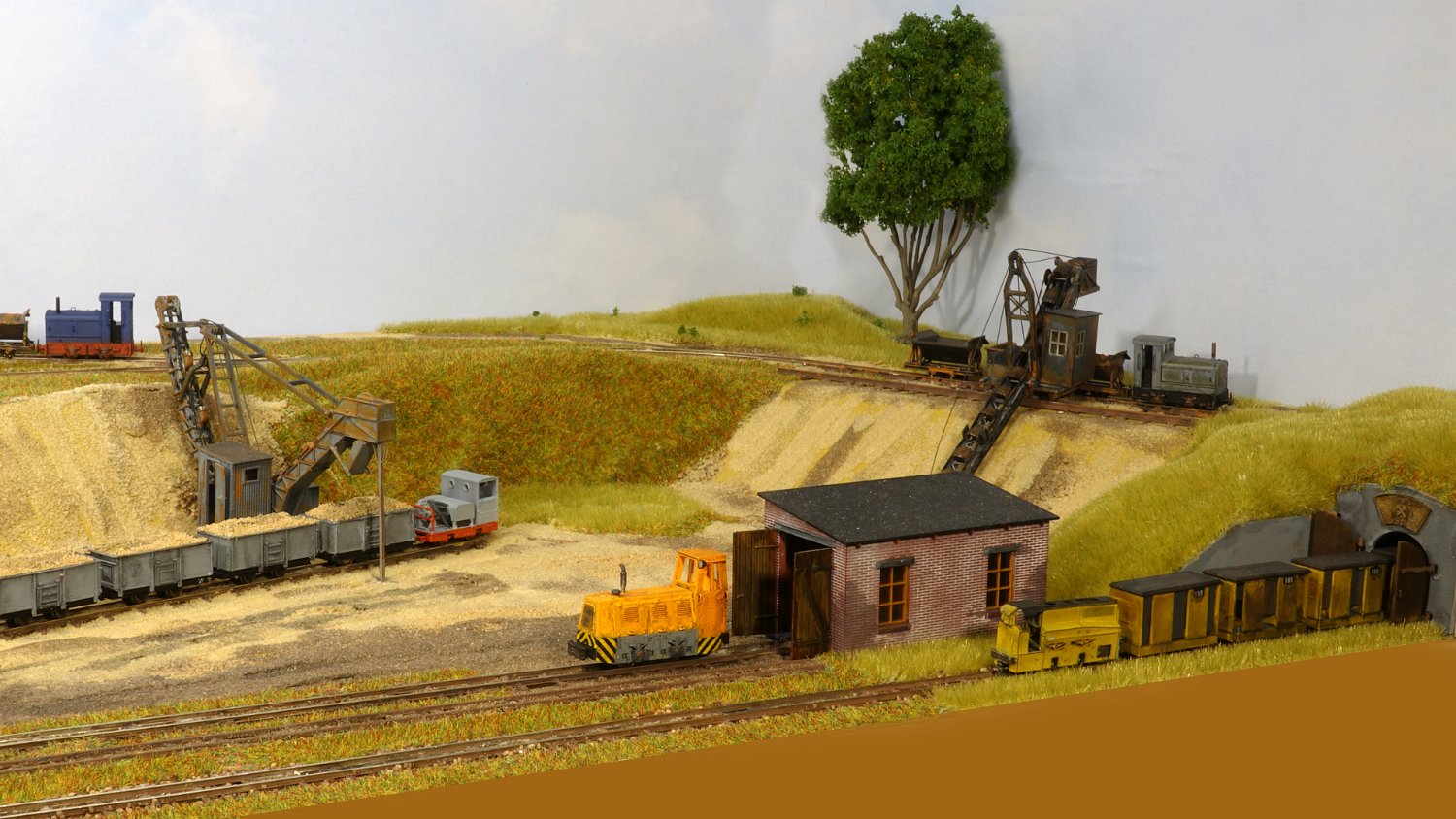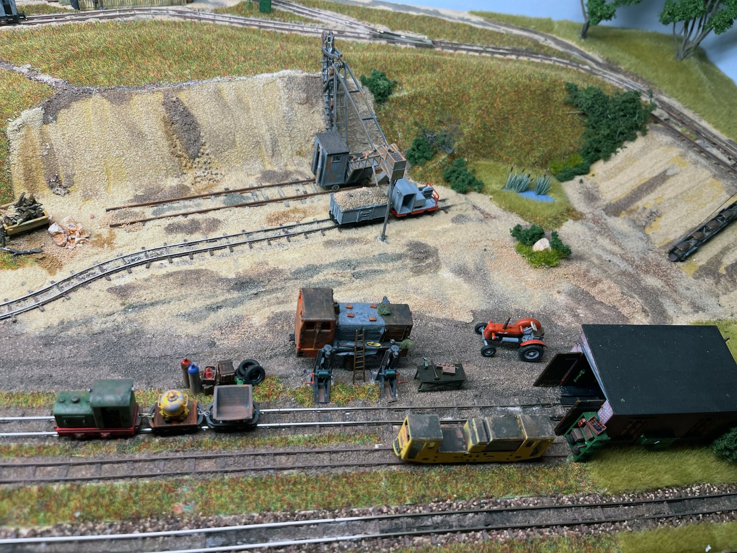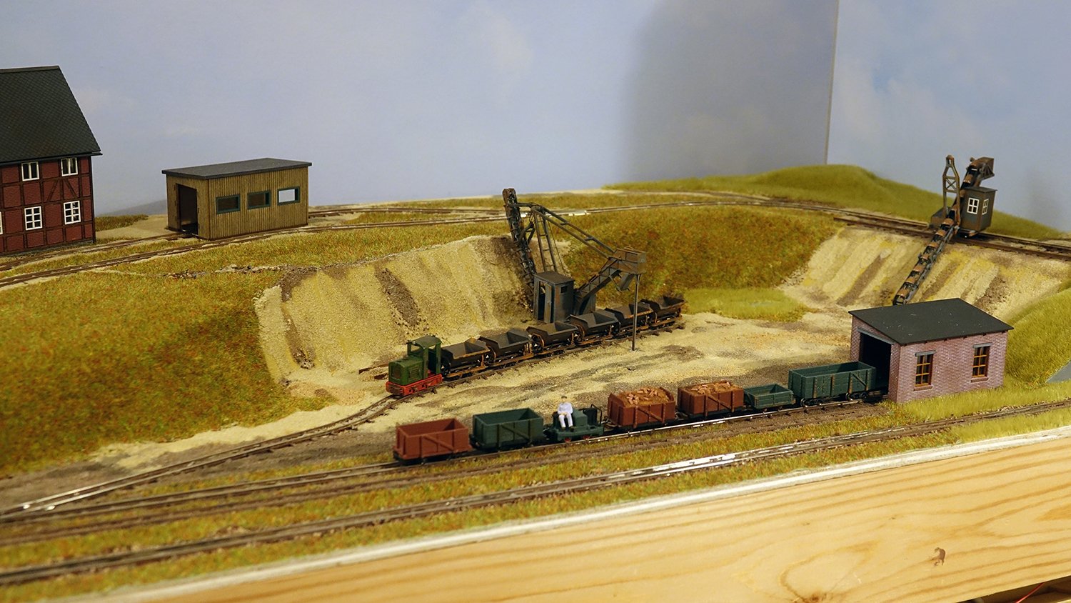 30 Die untere Ebene macht Fortschritte: Auf einer Winde wartet ein V10C auf die Aufarbeitung, am Tümpel wächst Schilf und der zweite Bagger steht endlich mit straffen Seilen richtig eingegleist da. |