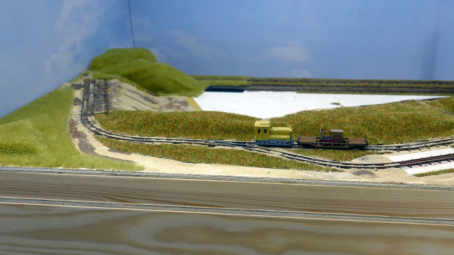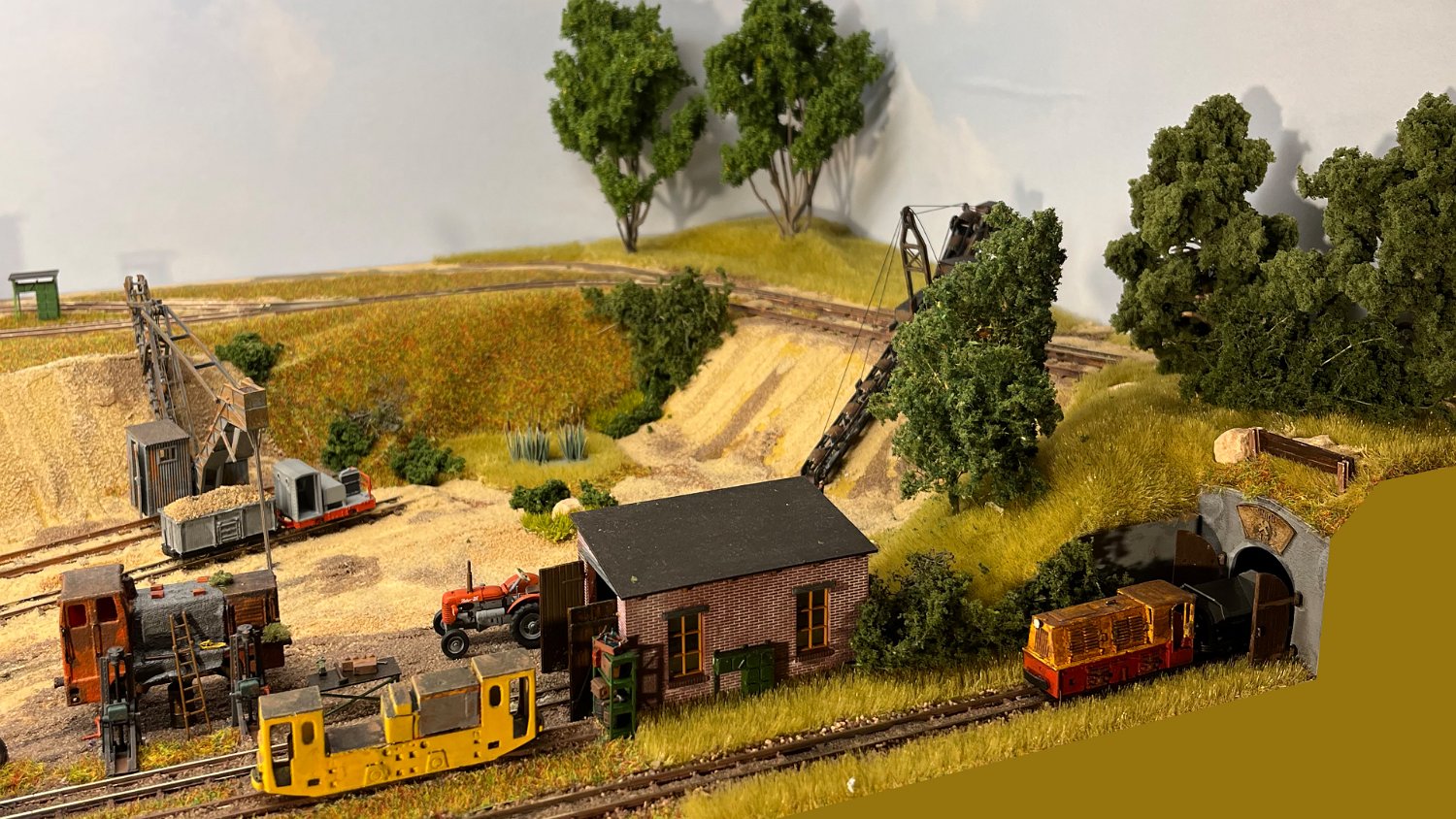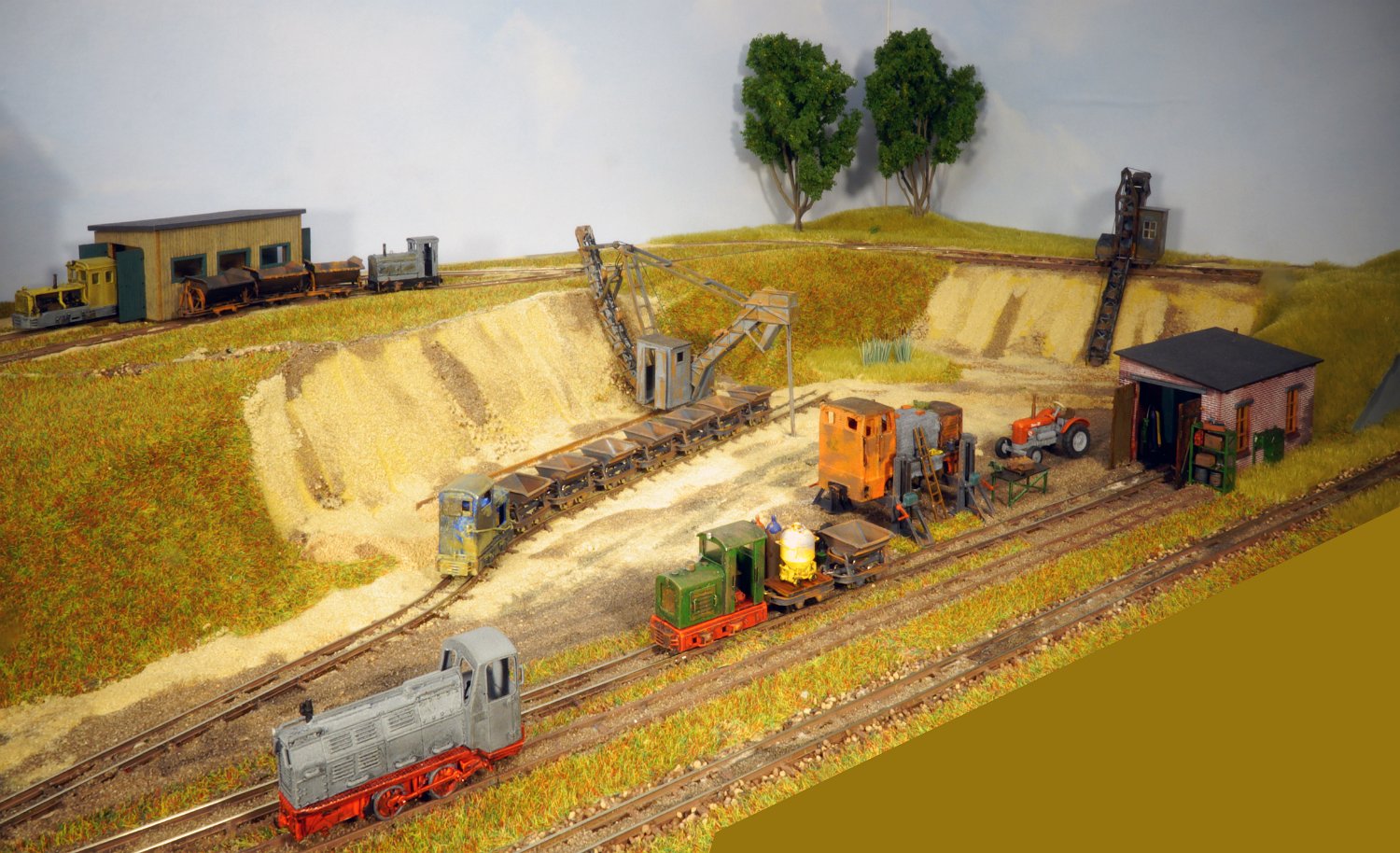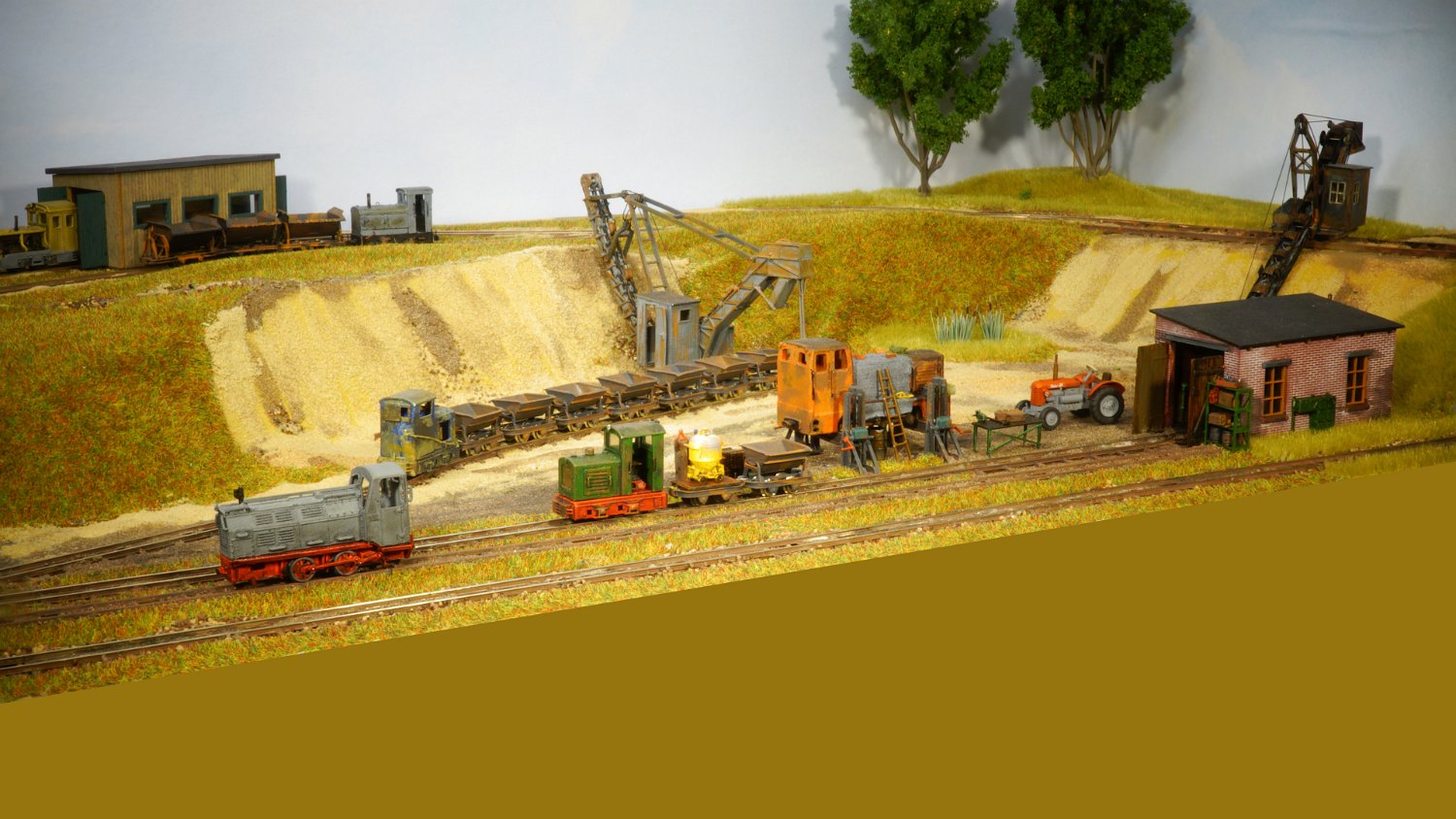 30 Die untere Ebene macht Fortschritte: Auf einer Winde wartet ein V10C auf die Aufarbeitung, am Tümpel wächst Schilf und der zweite Bagger steht endlich mit straffen Seilen richtig eingegleist da. |