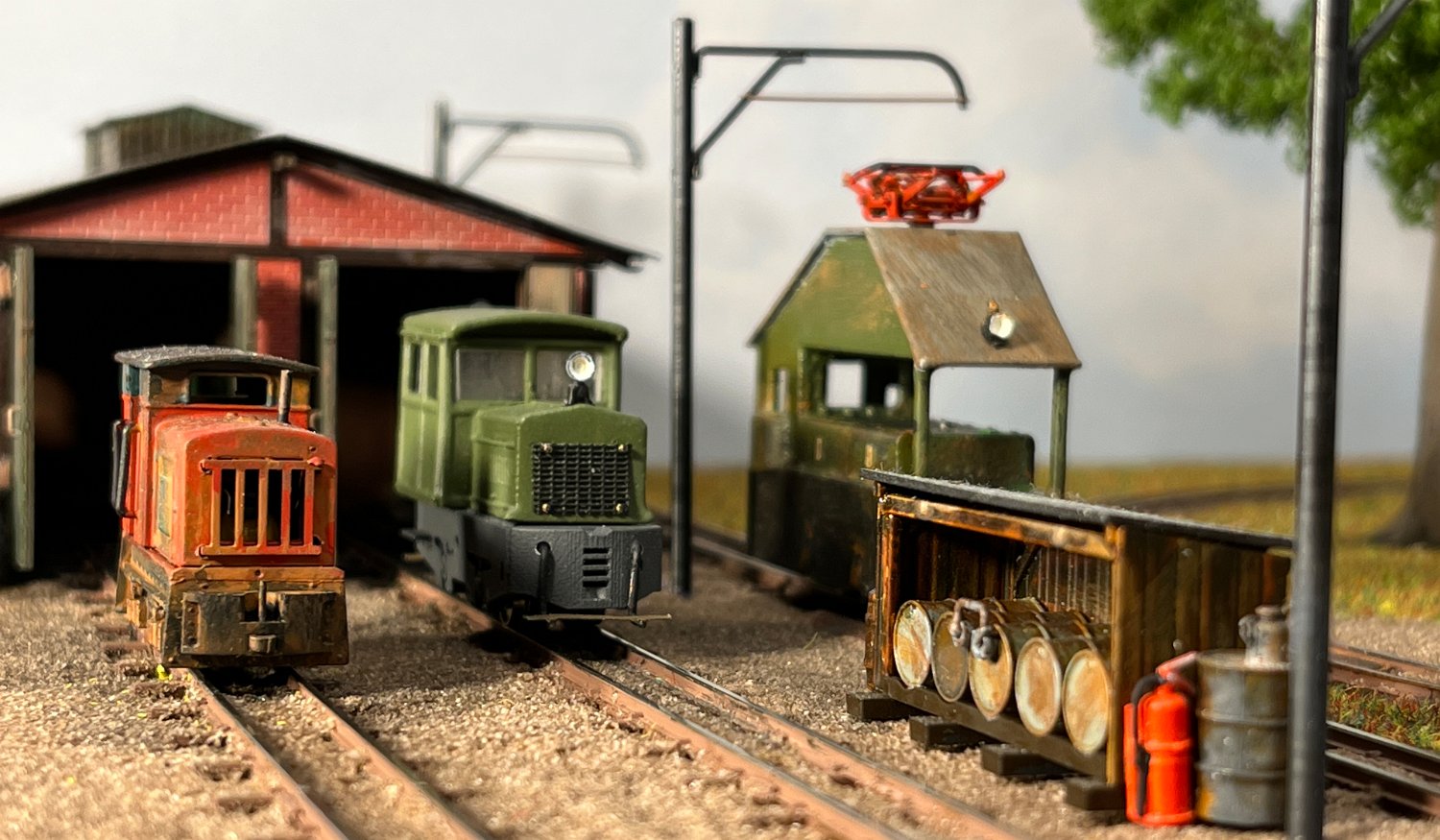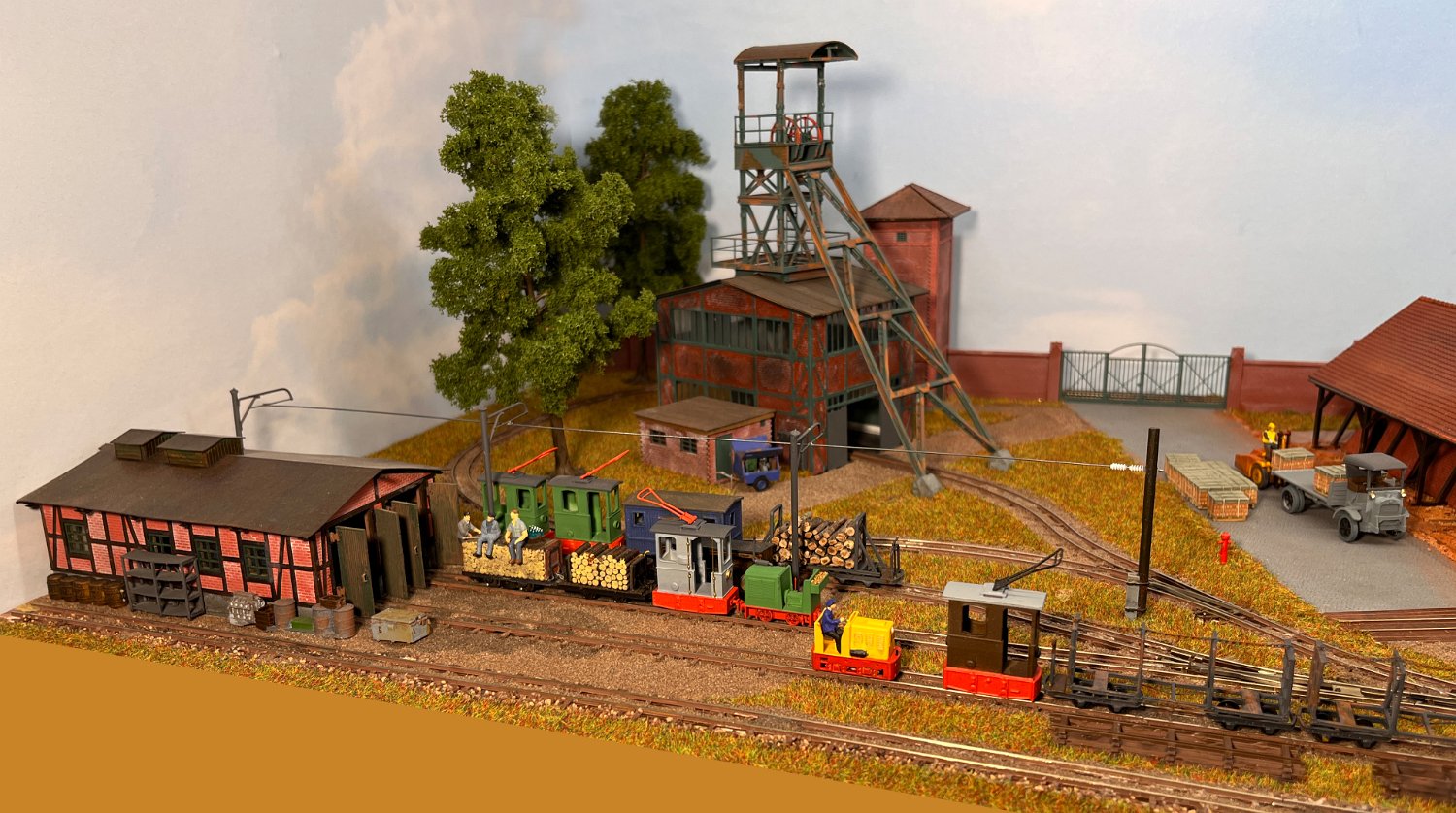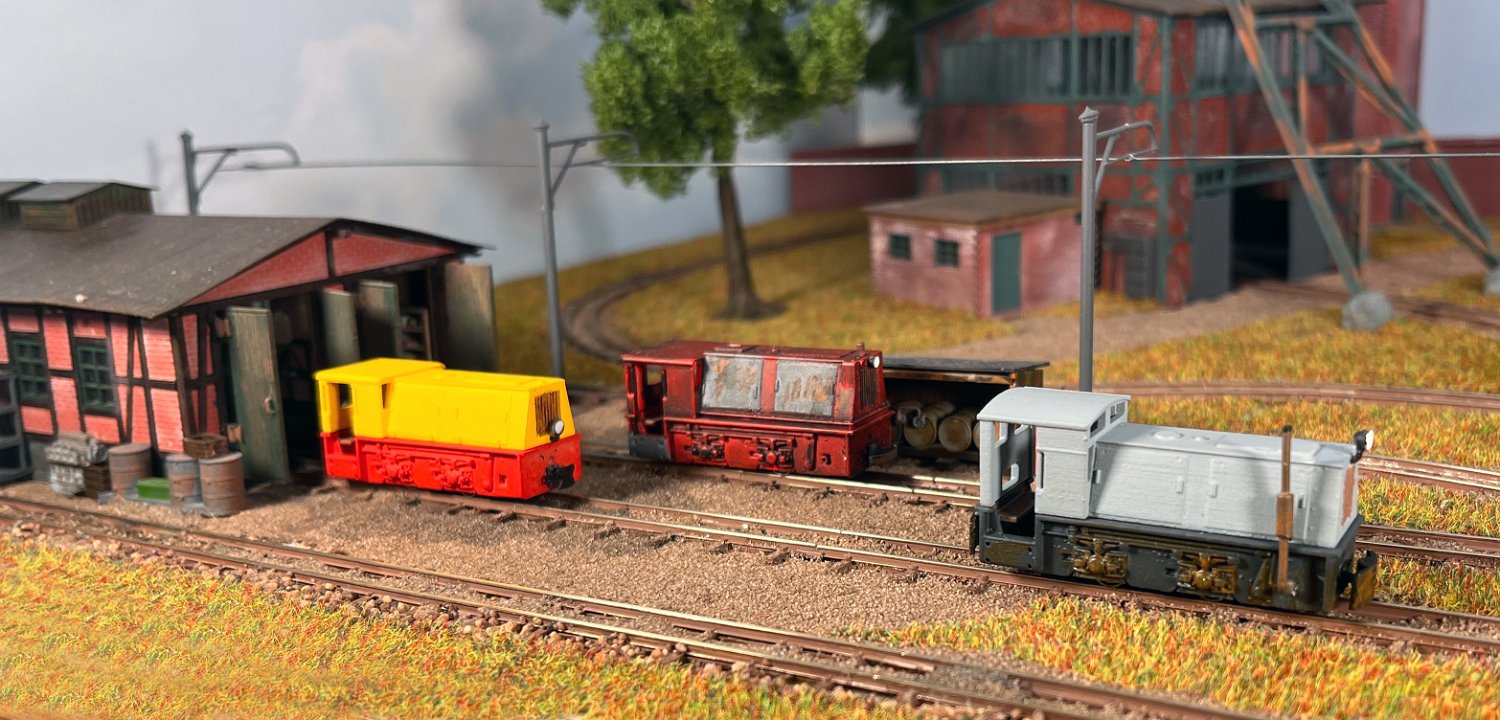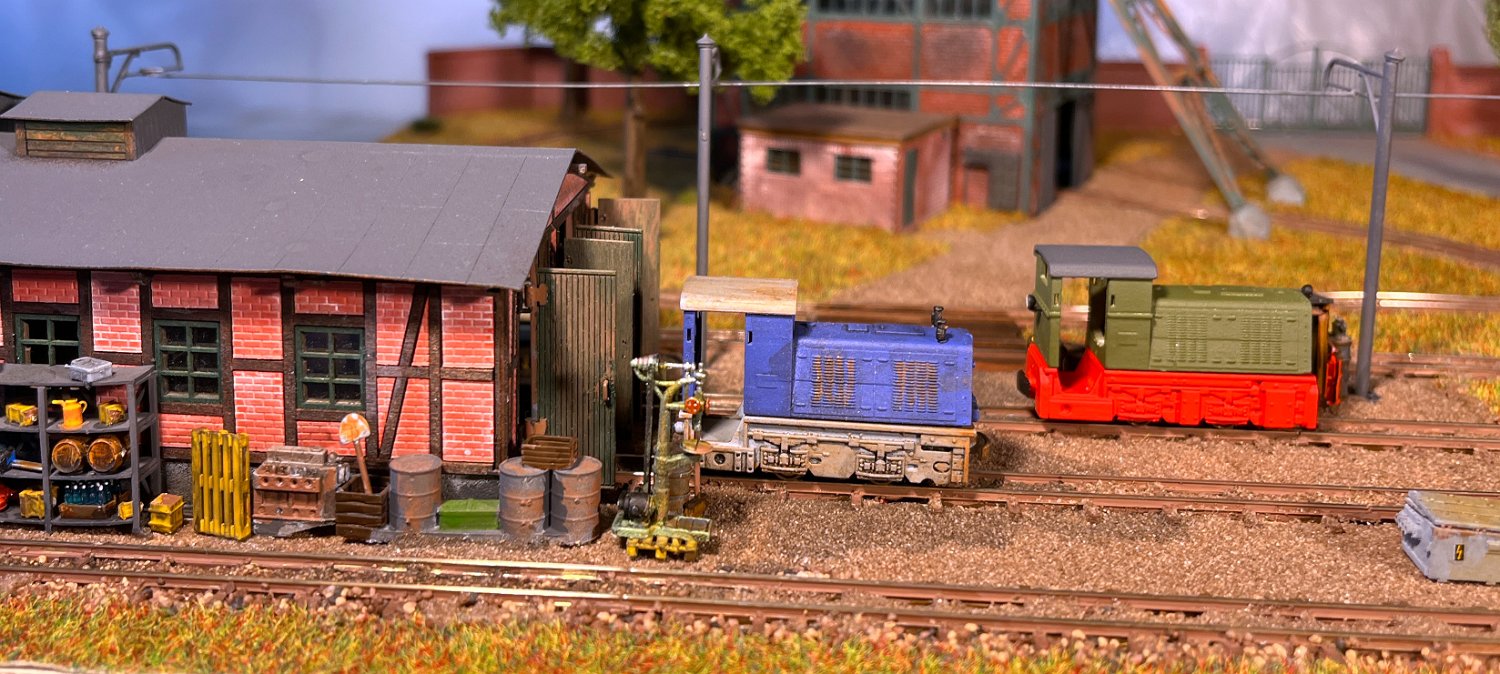 29 Zwei Jung ZL 233 an der Dieseltankstelle. Dahinter endet die elektrifizierte Strecke die irgendwann von einem Waldbahn-Modul kommen soll. Dafür stehen zwei SSW-Fahrleitungsloks zur Verfügung. |