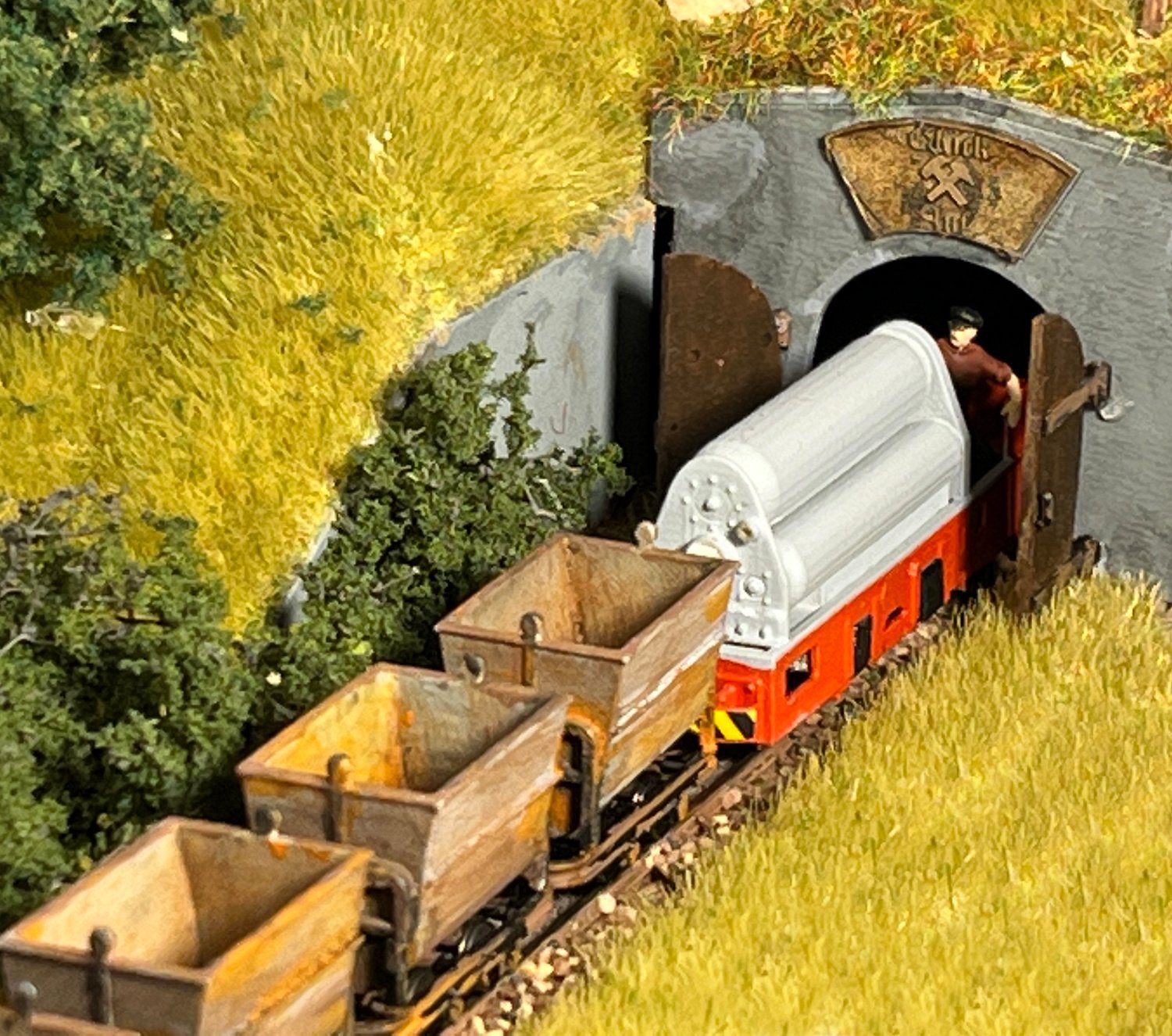 54 Die Druckluftlok Pz 20 fährt in den Tunnel, der allerdings nur eine Loklänge tief ist. |