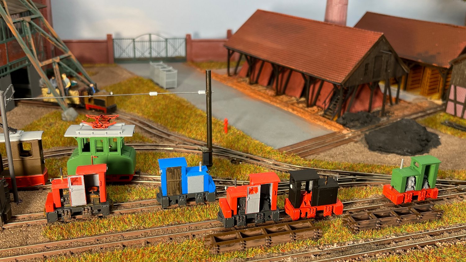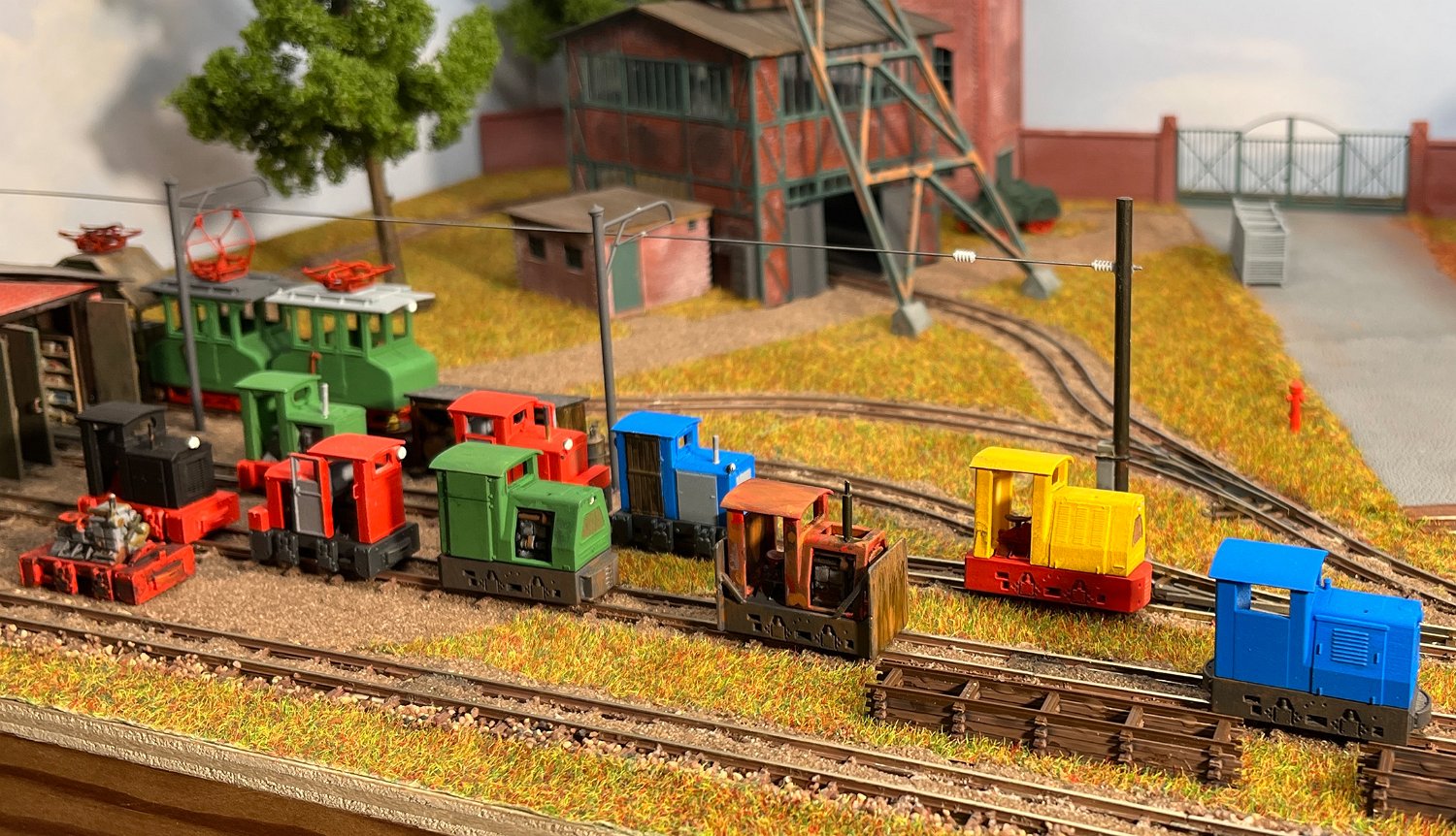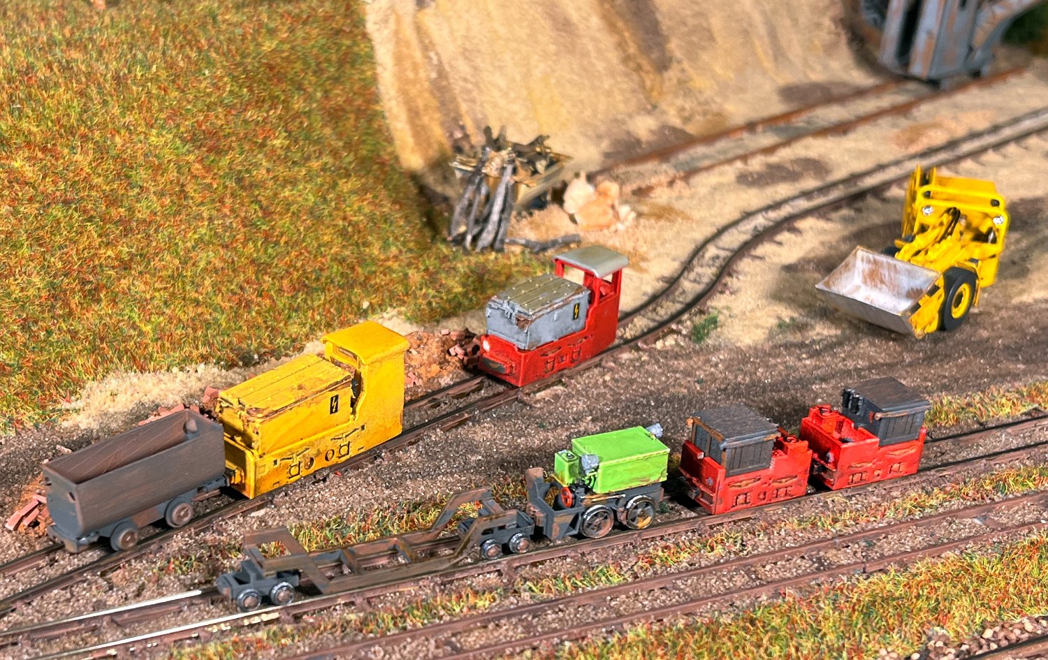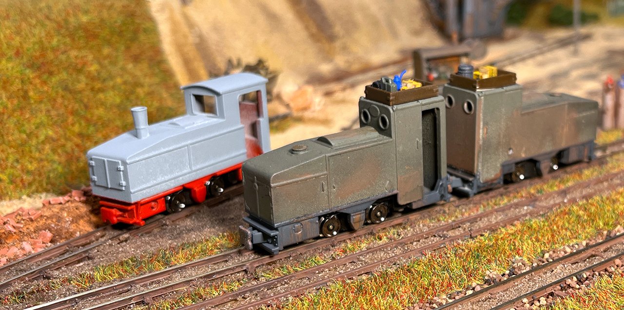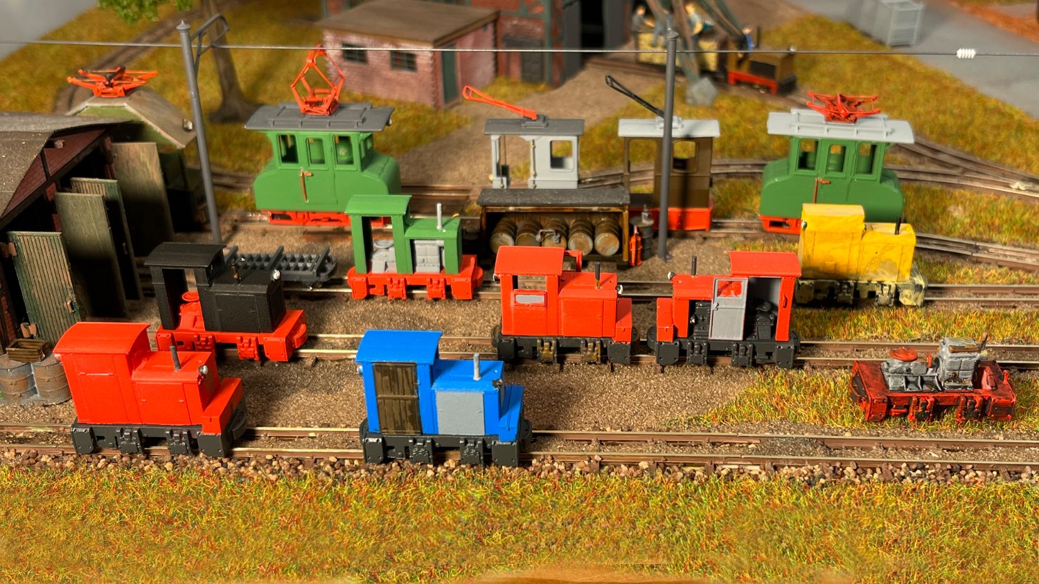 170 Vorn die kleinsten Akku-Loks in meinem Museum: Links ein Karlik (Bausatz micro_miners) sowie zwei Siemens 1A2, bemerkenswert der Universalfahrlader als Fertigmodell von micro-miners. |