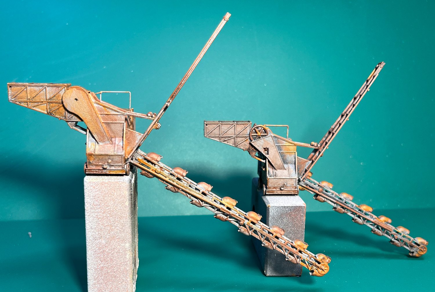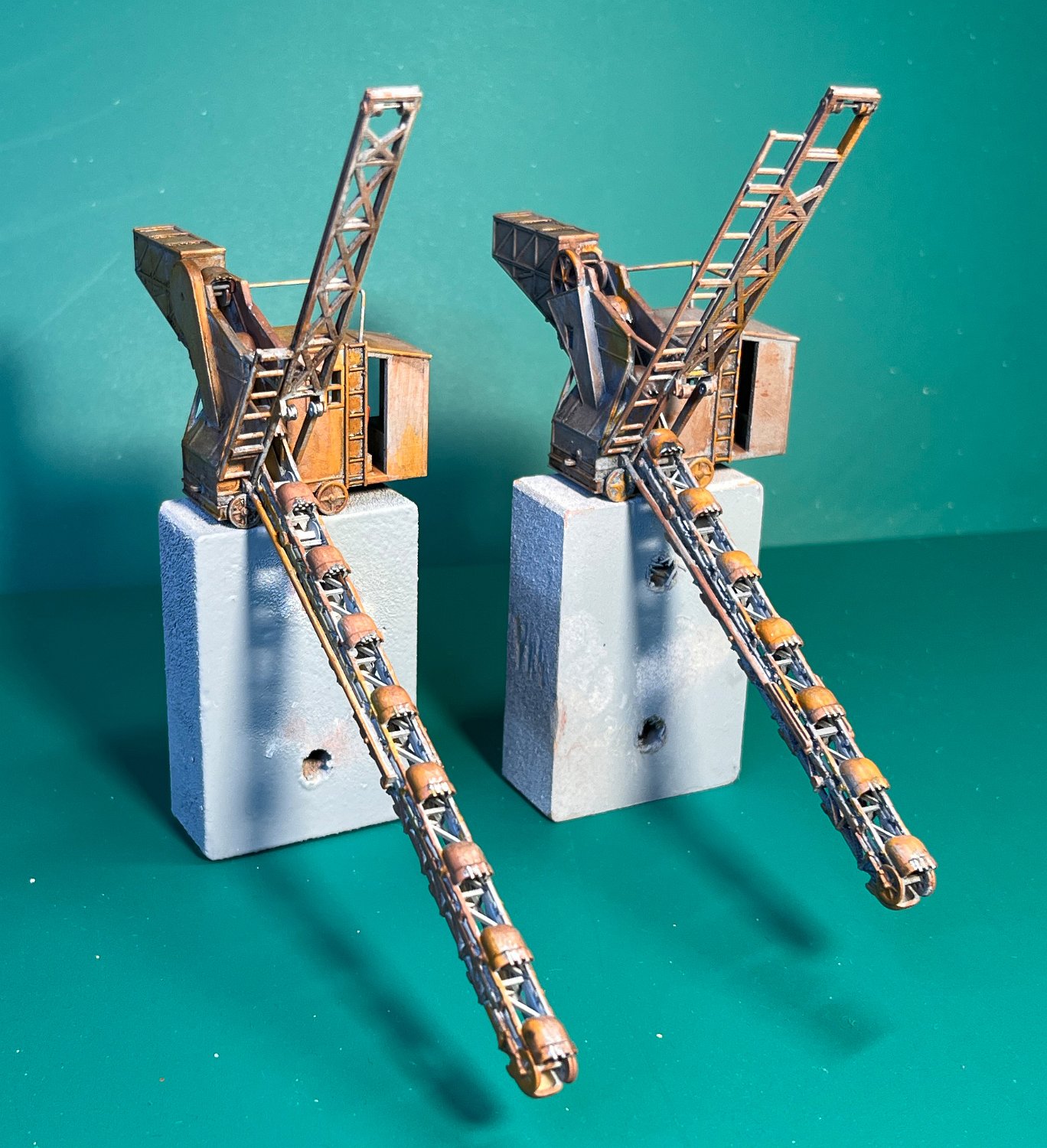 143 Mein Eimerkettenbagger in zwei Varianten: Der Linke 1972 in der Ziegelei Winningen vermessen, war für das Diorame zu groß. So entstand nach Fotos aus Mildenberg eine Variante mit kürzerem Ausleger. |
