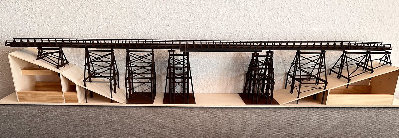 178 Nach einer Musterzeichnung der Deutschen Eisenbahnpioniere um 1900 entstand die Feldbahnbrücke. Mit 7 Stützen und 8 Fahrbahnteilen ist sie 1035 mm lang. |
